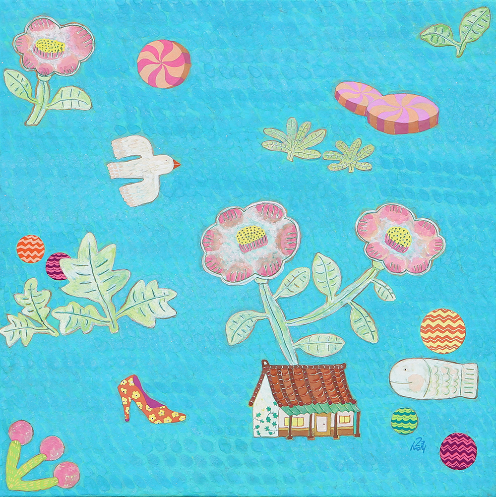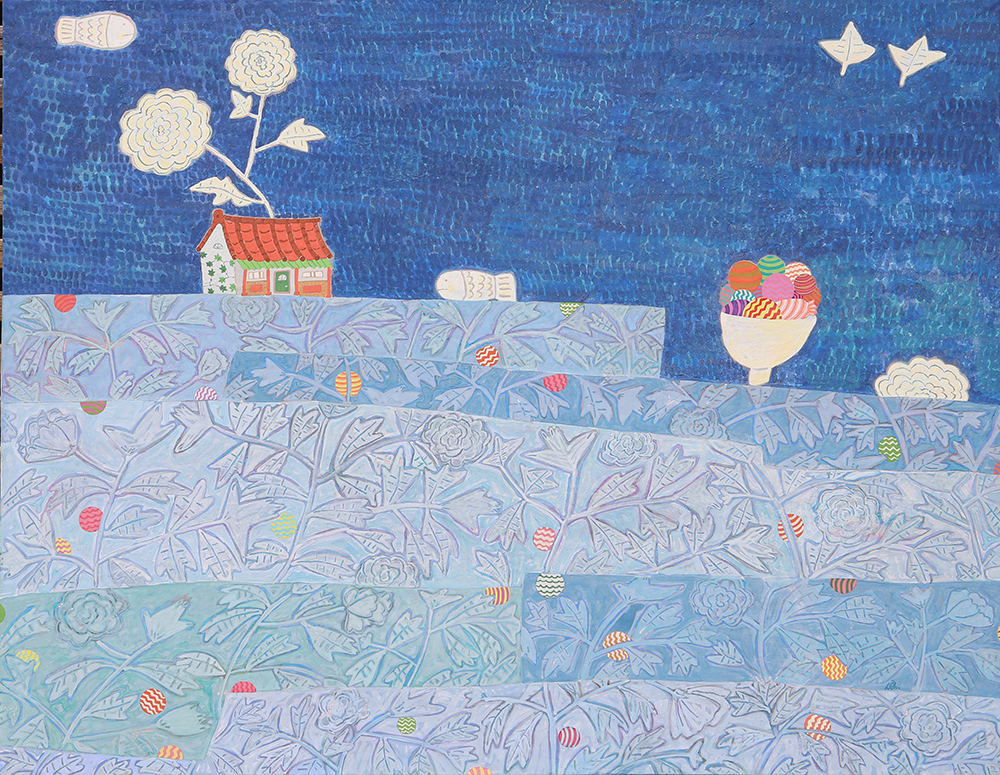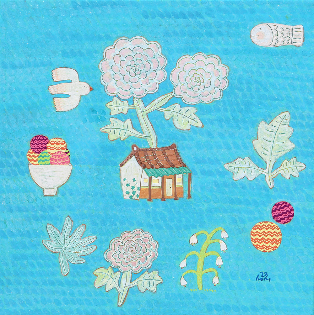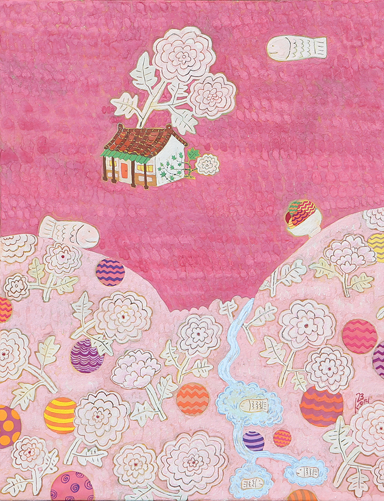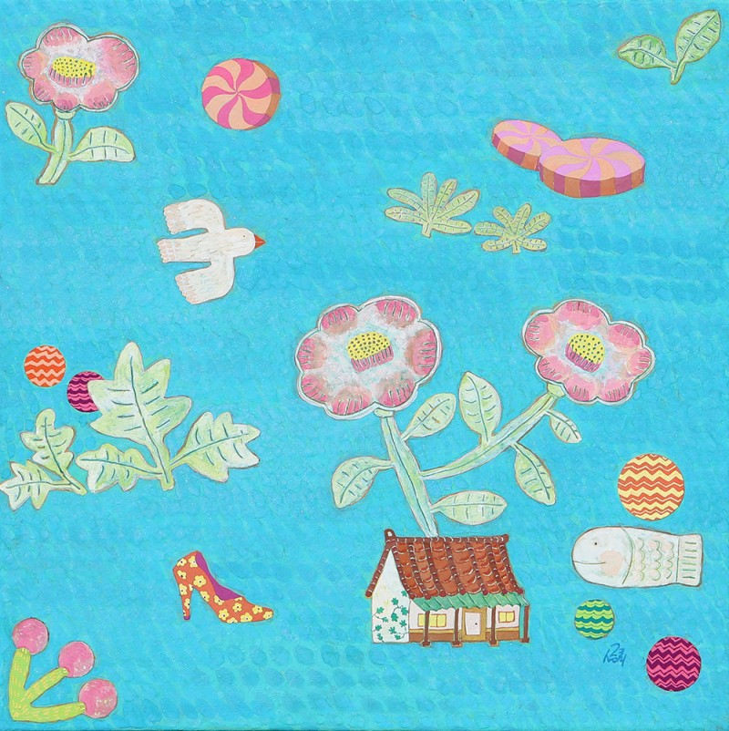 작품설명 장지壯紙의 바탕에 무수히 많은 반복적인 붓질로 색을 얹어나가는 과정을 거쳐야만 완성될 수 있다. 여러 번의 바탕 채색으로 얻은 중첩된 느낌은 그 자체로 시간의 집적集積을 의미한다. 그 위에 서로 다른 조형 요소를 가진 이질의 개체가 만나 조화로운 관계를 형성하고 새로운 어울림을 만들어 낸다. 시간의 집적 안에서 그것들의 조우는 스스로의 의미를 넘어서게 한다. 그리고 그 만남으로 생긴 새로운 일들이 나의 그림에서 펼쳐지고 있다. 그 새로운 일은 은근히 창조적이며 사랑스러우며 보는 이를 긴장하게 한다.