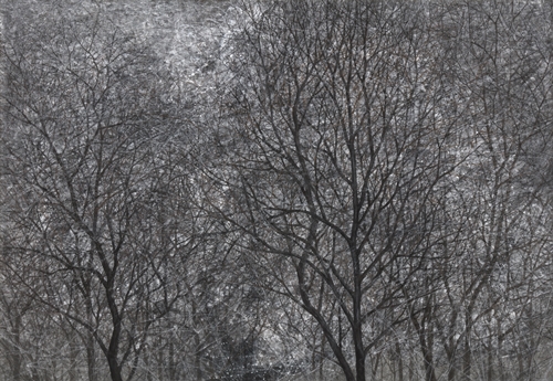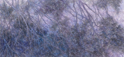 2015년에 열린 개인전 <The Moment>에서 김은진은 “나무들”을 그렸다. 그렇지만 나는 당시 김은진의 작품을 간단히 ‘나무 그림’으로 지칭할 수 없는데 여기에는 이유가 있다. 일단 이 작품들에서는 비물질, 비대상이라 할 “빛”이 유난히 눈에 들어온다. 김은진 자신의 표현을 빌자면 그것은 “달빛을 받아서, 하얀 눈빛을 받아서, 혹은 가로등 아래에서, 은은한 불빛에 빛나는”(2015, 작가노트) 모습들이다. <The Moment>의 주무대인 ‘밤’은 빛이 돋보이는 순간이다. 특히 눈 쌓인 겨울밤은 빛의 존재감이 가장 두드러진 시-공간에 해당한다. 게다가 2015년의 김은진은 방해말(方解末)을 써서 그 빛에 물질성, 실질성을 부여했다. 화가의 덧붙이는 행위로 인해 그림 표면에 방해말과 함께 엉겨 붙은 금박과 은박들의 “반짝반짝 빛나는” 현상을 언급할 수도 있다. <The Moment> 연작들(2015)에서 나무의 거친 질감들, 그 숲의 검붉은 색채와 음영들은 확실히 빛의 지각적 체험과 불가분의 관계에 있었다. 빛 체험은 몸의 감각과 얽혀있다는 점에서 이 작품들을 “빛의 효과로 창출된 순간적이고 신체적인 공간에 대한 탐색”으로 해석할 수도 있을 게다. 2015년 전시에서 천명된 ‘빛’과 ‘지각’의 문제를 김은진의 최근 작업에 접근하는 단서로 삼을 수 있다. 가령 <shadow>(2017), <뒤집힌 시간>(2017)과 같은 근래의 작업들에서 김은진은 벽에 비친 나무(가지들)의 그림자를 그렸다. 우리가 잘 알고 있듯 그림자는 빛의 산물이고 따라서 빛과 마찬가지로 비물질적이다. 그런데 흥미로운 것은 이 화가가 그림자의 비물질적인 네거티브(negative) 형상에 물질적이라 할 만한 포지티브(positive) 요소들을 부여했다는 점이다. 즉 나무 그림자는 -다시금 화가의 덧붙이는 행위를 통해- 포지티브의 요소들, 즉 윤곽, 색채, 질감, 음영, 두께 같은 것들을 지니게 됐다. 그렇게 되면 본래 거꾸로 된, 즉 원본에 대해 뒤집혀 있는 나무그림자는 사실상 그 원본인 나무처럼 보일 수 있다. 따라서 이 작품들은 감상자를 난처하게 할 텐데 왜냐하면 그가 그것을 나무처럼 보려고 할 때는 그림자 같은 성질들이, 그림자처럼 보려고 할 때는 나무 같은 성질들이 자꾸 눈에 들어올 것이기 때문이다. 몸의 방향을 결정하는 것도 문제다. 즉 그것이 뒤집혀 있기에 감상자는 위와 아래, 왼쪽과 오른쪽을 결정하는 데 애를 먹을 수밖에 없다. 그런가하면 깊이 지각(depth perception)도 문제가 될 것인데 왜냐하면 그가 그것을 나무처럼 볼 때는 나무 안쪽 탁 트인 공간을 감지할 수 있을 테지만, 벽에 비친 그림자로 볼 때는 그 안쪽에 마땅히 아무 것도 없을 것-막혀있는 벽이 있을 것-이기 때문이다. ‘깊이’의 문제를 좀 더 다뤄보기로 하자. 주지하다시피 눈의 망막에 맺힌 상은 그 자체로 깊이를 갖지 않는다. 눈에 보이는 대로 그렸다는 클로드 모네의 그림이 평평하게 보이는 이유다. 물론 가까이 있는 것은 크게, 멀리 있는 것은 작게 보이지만 우리 눈(망막)에는 오로지 크고 작은 사물들의 상이 맺힐 뿐이지 거리(깊이) 자체가 맺히는 것은 아니다. 따라서 깊이는 대상 자체가 아니라 보는 주체의 관점에 속해 있다고 할 수 있다. 어떤 의미에서 깊이는 정면에 있지 않고 측면에 있다. 그렇다면 정면에서 깊이를 운운하는 일은 메를로-퐁티가 말한 대로 “측면에서 파악된 넓이la largeur considérée de profil”를 암암리에 전제하고 있다고 할 수 있다. 결국 정면에서 보면서도 “측면에서 파악된 넓이”를 끌어들여 깊이를 만들어내는 것은 주체의 지각이다. 그래서 메를로-퐁티는 “깊이는 나와 사물의 관계이다”라고 한 것이다. 확실히 깊이는 다른 공간적 차원들에 비해서 훨씬 더 사물과 몸(지각)의 관계에 깊이 연루되어 있다. 다시 김은진의 최근 작업으로 돌아오면 문제의 <shadow>나 <뒤집힌 시간>에서 감상자는 종래의 풍경화나 산수화를 볼 때와 똑같은 방식으로 깊이를 지각할 수 없다. 무엇보다 묘사된 형상들이 벽에 맺힌 그림자 이미지라는 것이 문제다. 따라서 감상자는 깊이를, 그 안쪽에 있을 것으로 가정된 시원한, 탁 트인 공간을 환하게 들여다볼 수 없다. 대신 그에게는 물질적이고 현실적인 깊이, 곧 겹겹으로 쌓인 두툼한 안료의 층들이 주어져 있다. 그 물질적 공간의 깊이, 두께는 멀찍이 떨어져 그저 눈으로 관조하는 식으로는 지각하기 힘들다. 그 두께를 지각하려면 작품에 가까이 다가가 그 표면에 얽혀있는 것들을 눈으로 매만지며 “긁고, 뿌리고, 찍고, 붙이며 긁어 없애는” 작가 몸의 궤적을 추적할 필요가 있다. 즉 자신의 살아있는 몸을 수행해야(일으켜야) 한다. 그런 의미에서 이 작품들 역시 대단히 신체적이라고 말할 수밖에 없다. 방금 전에 <shadow>나 <뒤집힌 시간> 표면의 “얽혀있는” 것들을 말했는데 여기서 얽혀있는 것들은 재료들만이 아니다. 여기서는 주체/대상, 인간/공간도 서로 얽혀있다. 즉 여기서 주체는 대상, 곧 자기 앞에 있는 그림, 자기에게 주어진 공간을 익숙한 지각방식이나 몸틀(un schéma corporel)로 온전히 파악할 수 없다. 그것을 지각하고, 파악하려면 주체는 자기 몸을 그림-공간에 개입해야 한다. 즉 여기서 주체와 대상은