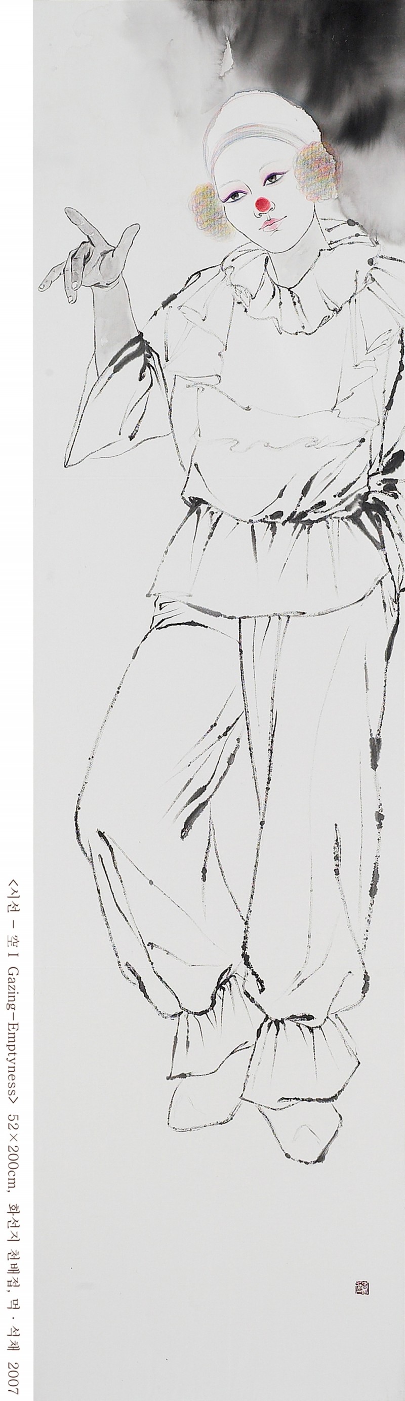 Ⅰ. 사회 및 자신의 지향과의 괴리: 은현(隱現)·장로(藏露)의 숨김(隱·藏)의 미학에서 드러냄((現·露)의 미학으로: 2007년 전시가 ‘숨김과 드러냄(隱現,藏露)의 미학’중 숨김(隱·藏)의 미학이 主였고, 인물화 화면과, 발묵(潑墨)과 발묵의 흔적에 靑·紅·黃色 점이 있는, 마치 하늘의 현색(玄色)인 듯한 다양한 먹빛화면들을 붙여 자신의 이상과 사회현실과의 괴리를 감성적으로 극화(極化)한 자신의 구사(構思, 즉 구상)를 한지에 천배접을 한 후 수묵(水墨)과 석채(石彩), 채색, 금니(金泥)로 실현하던 수묵·채색화는 옆에 붙은 먹빛화면이 탈춤의 소매의 일부로 이어지면서 그 하늘이 다른 하늘이 아니요 그녀의 하늘임을 밝혔었다. 그러나 2008년부터 그러한 연관이 사라지고, 폭 수와 크기가 줄고 채색이 강화되면서, 일폭화로 진행되거나 인물이 강하게 자기를 주장하면서 하늘의 역할은 더 강화되었다. K. 해리스(Harris)가, 서양 현대에서 초상화가 사라진 이유를 인간에 대한 ‘존경’이 사라졌기 때문이라고 보았듯이, 한국화에서도 인간에 대한 존경이 사라진 듯, 국전시대에 맹위를 떨치던 인물화가 사라졌고, 있어도 왜곡되거나 변형되었다. 이제 인물화는 동서양 모두에서 신(神)이나 자연이 아니고, 인간이 인간을 변형시키고 왜곡하는 작은 신(神)이 되었다. 중국회화의 전성기인 북송 말 선화화단(宣和畵壇)에서 수묵산수화와 채색화조화의 번창에도 인물화·도석화가 양적으로 가장 많았던 것은 세상의 주인이 여전히 인간이었다는 반증이요, 한편으로는 그 당시 인물과 안마(鞍馬)를 포용할 수 있는, 이공린의 백묘화(白描畫)같은 창안이 있었기 때문에 가능했다고 생각된다. 그러나 80년대 이후 한국에서 추상화가 번창하면서 서양화, 즉 피카소의 <아비뇽의 처녀들> <게르니카>에서처럼 대상의 왜곡, 변형과 달리, 시간이 갈수록 인물이 거의 사라졌다. 그러나 한국화에서도, 서양 현대처럼 현대를 대변하는 해석과 표현방식의 창안이, 즉 현실에 근거한 창안이 필요하다고 생각된다. 그러한 의미에서 유희승의 그림은 전통의 현대적 창안이라는 면에서 또 하나의 예의 탐구로 적절하리라 생각된다. 단독인물상의 조합에서 군상(群像)의 수묵 선화(線畵)으로의 회귀와 채색 화훼화·인물화에 삽입된 화훼화: 상술한 2007년 전시의 ‘숨김과 드러냄(隱現,藏露)의 미학’은, 2008-9년 이후에는 그녀에게 세상에 대한 자신감이 회복된 듯, 인물화면이 독립인물상으로 독립해 먹빛화면의 도움을 받지만, 그들 두 화면의 ‘나뉨과 합함(分合)’은 자유분방한 역할이 줄고, 짙은 발묵의 먹빛 화면의 하늘의 역할이 강조되나 그 괴리만, 어두움만, 커졌다. 괴리의 해결 시도인 듯, 얼굴을 숨겼던(隱,藏) 짙은 화장, 피에로의 화장, 탈, 고깔 등의 요소들이 사라지는 현대여성의 ‘드러남(現·露)’의 미학이 시작되면서, 여인의 머리부터 아래로 이어지는 금빛이나 채색 새의 화려함은 그녀의 불안의 역설적 표현이거나 어떤 ‘영원’에 대한 염원이 자리 잡은 것이 아닌가 하는 생각이 들고, 전통 초상화에서의 정면상의 등장, 인물에 불보살(佛菩薩)의 원형 두광(頭光)이나 원형 신광(身光)의 등장, 인물의 얼굴을 네모 화면으로 둘러싸는 이중, 삼중화면 등은 그러한 ‘드러남’의 미학으로 여인의 심상의 괴리, 즉 화의(畵意)의 간극의 심화를 역설적으로 표현한 것으로 보인다. 그러나 2012년 화훼화나 화훼절지(花卉折枝)에서는 2007년의 인물화면처럼 먹빛화면을 동반하나, 2008-9년처럼 먹빛 화면에 또 더 짙은 먹빛화면이 들어가는 이중화면이라든가, 발묵의 색이나 먹으로 형과 색이 흐려지거나 원형, 마름모형이 등장하기도 하는데, 이러한 분합이나 화면의 변화는 그녀의 세상을 보는 시각이 변했음을 보여준다. 서양화에서는 새나 꽃은 ‘금방 사라짐’의 알레고리로 쓰였으나, 그녀의 그림에서는 아름다운 채색 화훼화로 독립된 꽃들은 대상을 사회현상전체로 이해하기보다는 어떠한 어려움에도 매년 철이 되면 피는 꽃의 성(性), 즉 ‘자연(自然)’을 금니로 ‘영원’을 상징하고, 옛 화조화처럼 잠깐 아름다운 꽃으로 눈을 돌리면, 그녀가 말하듯이, 그 화려하고 아름다움이 우리에게 ‘위로’,‘평화’‘자유’‘사랑’이 되어, 그녀의 간극은 그러한 ‘자연’으로 보상되었다. 그러나 꽃과 새, 나비는 몰골(沒骨)의 색이 동양화의 궁극목표인 ‘평담(平淡)’이기는 하나 아직 ‘간솔(簡率)’로는 가지 못해, 사회의 엄중함은 아직 괴리의 해결 과정임을 보여준다. 한편 성장한 여성그림에서는 발묵이 농색으로 강화되고, 옆에 붙은 먹빛화면도 다양해져, 하늘의 역할은 더 커지고 다양화되었다. 여인은 심해지는 불안을 역설적으로 짙은 화장으로 덮거나 양귀비 등의 화려한 적(赤)·황색(黃色)의 절지(折枝) 꽃과 새, 나비로 성장(盛裝)하고, 얼굴만의 소(小)화면의 크로즈 업이 등장하는가 하면, 그들 절지(折枝)의 붉은 양귀비, 노랑·파랑 꽃이나 화분에 심겨있는 매화, 절지 매화, 청화백자 속에 꽂혀 있는 모란이나 양귀비는 화훼절지(花卉折枝)로 분화하고, 2012년부터는 자기(磁器) 화분에 담기거나 화병에 꽂혀 있는 