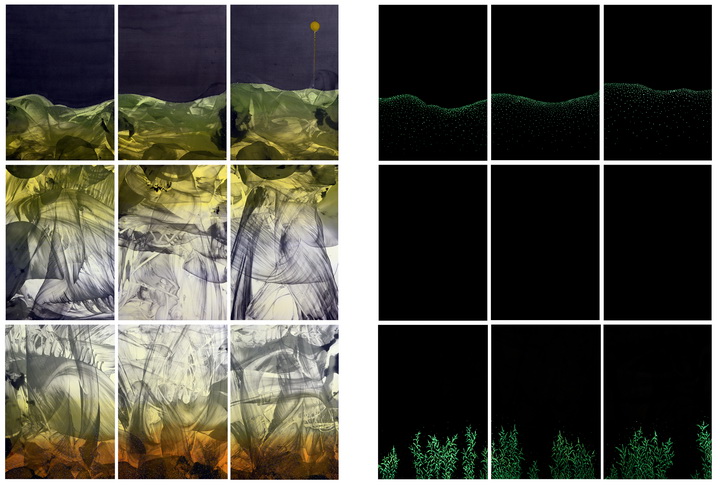 본 전시는 마블링 기법에서 차용하여, 기름이 물 위에서 자유롭게 흘러 노닐며 나타내는 우연한 형상을 종이에 그대로 떠내는 흔적인 것이다. 이 흔적은 다시 동양화의 산수 이미지로 탄생하게 된다. 자연과 인간의 존재의 의미를 산수 속에서 되새김으로써 시간과 기억을 재생하는 공간으로 삼는 것이다.