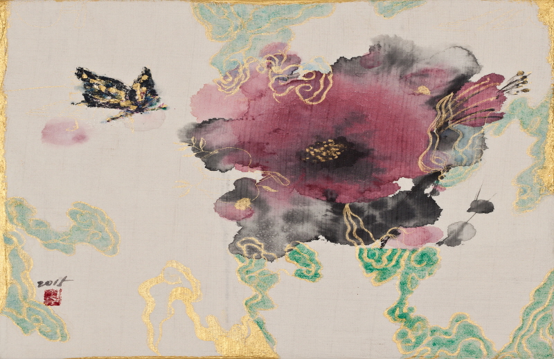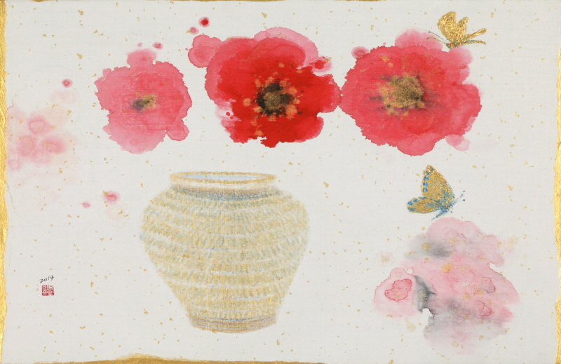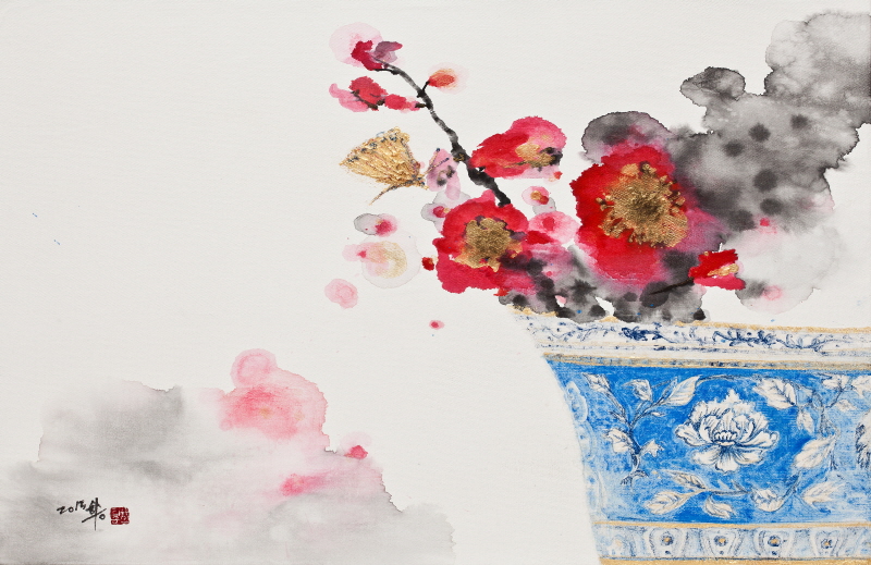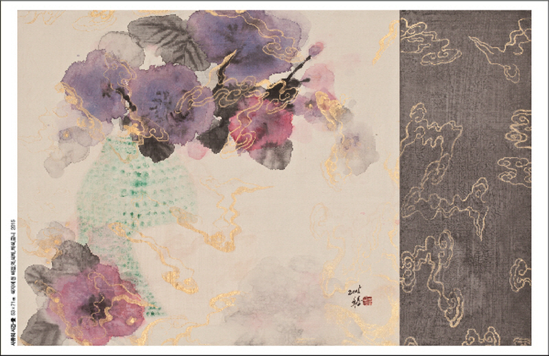 -수묵과 채색- 작품에 등장하는 꽃과 나비는 강한 생명력과 우리를 유혹하는 아름다움을 대표한다. 꽃의 표현은 한편으로는 색채의 효과 때문이요, 다른 한편으로는 이미지가 갖고 있는 전통적 의미를 통해 이상향을 추구하고 있는 것이다. 작품에 표현된 꽃은 현대를 살아가는 우리들에게 위안과 기쁨을 안겨주는 안식처의 역할과 신비하고 환상적인 세계로 안내해 주는 이중적 존재이다. 색채는 오늘을 사는 현대인의 시대적 감성적인 언어이다. 색채가 없이는 현대인의 감각이나 감성을 바람직하게 표현 할 수가 없다. 면의 기능을 수행하고 있는 먹은 채색과 마찬가지로 장식적인 요소가 된다. 따라서 본인에게는 먹과 채색이 어떻게 적절히 배합되는가가 중요한 것이다. 수묵의 번지기 기법은 원색의 채색과 서로 충돌하거나 갈등을 보이지 않고, 오히려 조화를 잘 이루고 있다. 그만큼 수묵은 지각적으로나 화학적으로 깊은 포용력을 갖고 있다. 본인의 선염기법은 먹이 채색과 조화를 이루면서 담채적인 효과를 나타내고, 이곳저곳 공간에 배치하는 기획성을 갖고 진행된다. 이러한 모노톤의 수묵 사용은 비대상성의 화면을 표현하고자할 때도 마찬가지이다. 1. 전시제목: ‘봄-따뜻한 기억’ |