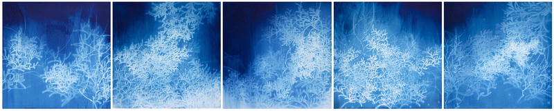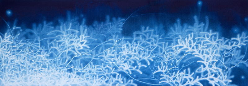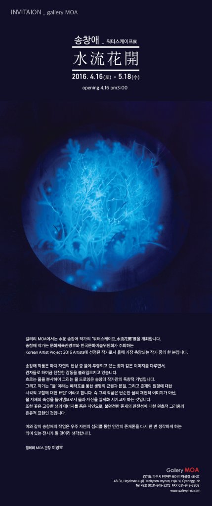 작가노트 『워터스케이프_水流花開』 1. 물(水) 워터스케이프(Water_scape)는 ‘물 풍경’으로 ‘물(水)로 그린 물(物)그림’이라는 중의적 의미를 내포하고 있다. 물은 작품의 소재, 주요 표현기법, 그리고 그 안에 함축된 의미 모두를 담는 하나의 그릇이다. 2. 이수관지(以水觀之) 물로써 세상을 보다. 이수관지는 나의 예술관을 관통하는 핵심사상이다. 이는 장자의 이도관지(以道觀之: 도를 천지만물의 근본원리로 보는 세계관)에 근거하여 도를 물로 대치한 것이다. 노자는 도무유수(道無水有: 도는 없고 물은 있다)라 하여 모든 자연물 중에서도 물을 도(道)와 가장 가까운 것으로 삼고 만물의 이치를 물에 비유하여 설명하였다. 나의 작업은 물이라는 메타포를 통한 생명의 근원과 본질, 그리고 존재의 원형에 대한 시각적 고찰이다. 3. 물아일체 (物我一體) 물아일체는 물(水)을 통한 물(物)과 나의 혼연일체를 뜻한다. 주체와 객체, 관념과 현실, 물질계와 정신계 등, 세상에 존재하는 모든 이항대립적 관계로부터 벗어나 사물과 내가 하나 되는 비분별지의 세계를 추구한다. 이것이 내가 물로써 물을 그리는 가장 큰 이유이다. 즉, 물의 재현적 이미지가 아닌 물자체의 속성을 드러내는 것에 초점을 둔다. 흐르는 물을 분사하여 그리는 ‘물드로잉’은 나만의 독창적인 표현기법으로, 고도의 집중력과 몰입을 요한다. 물의 완전한 통제란 불가능하기 때문에 순간의 직관과 본성에 집중한다. 서서히 의식이 사라지며 무아와 무위의 경지에 이를 때 비로소 기운이 생동하게 된다. 물과 내가 일체가 되었노라고 장담할 수는 없지만 그림을 그리는 내내 나는 물과 땀과 눈물로 범벅이 되곤 한다. 4. 수류화개 (水流花開) 물 흐르고 꽃이 피네. 이번 전시의 부주제이자 소재를 내포한다. 이는 소동파의 ‘십팔대아라한송’ 중 아홉 번째 아라한에 나오는 문구(空山無人 水流花開)로 우주자연의 섭리를 의미한다. 어떤 대상을 욕구하거나 사유하지 않음(無爲)에도 불구하고 천지만물은 스스로 자기존재를 성립시키며 저절로 움직인다(自然). 따라서 모든 살아있는 존재는 물처럼 흐르고, 흐르는 모든 것은 유연하며 살아있다. 모든 존재는 꽃과 같다. 자신만의 고유한 생의 에너지를 품은 꽃이다. 나는 물과의 일체를 통해 나만의 고유한 내재적 에너지를 꽃의 형상을 빌어 드러낸다. 짙푸른 심해 속에서 피어난 물꽃은 불완전한 존재의 완전성에 대한 원초적 그리움의 은유적 표현이다. 생명을 흠뻑 머금은 물꽃은 나의 현존재의 산물이자 본성회귀에 대한 표상이다. 2016 水花 송창애