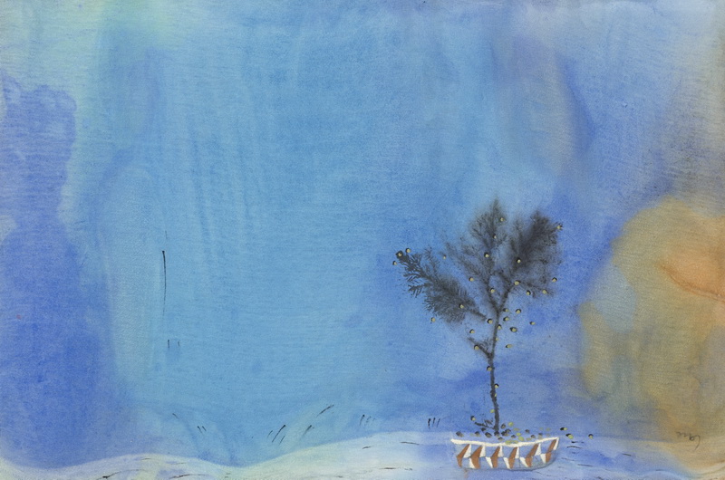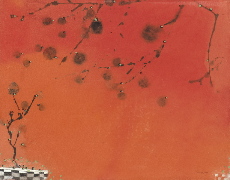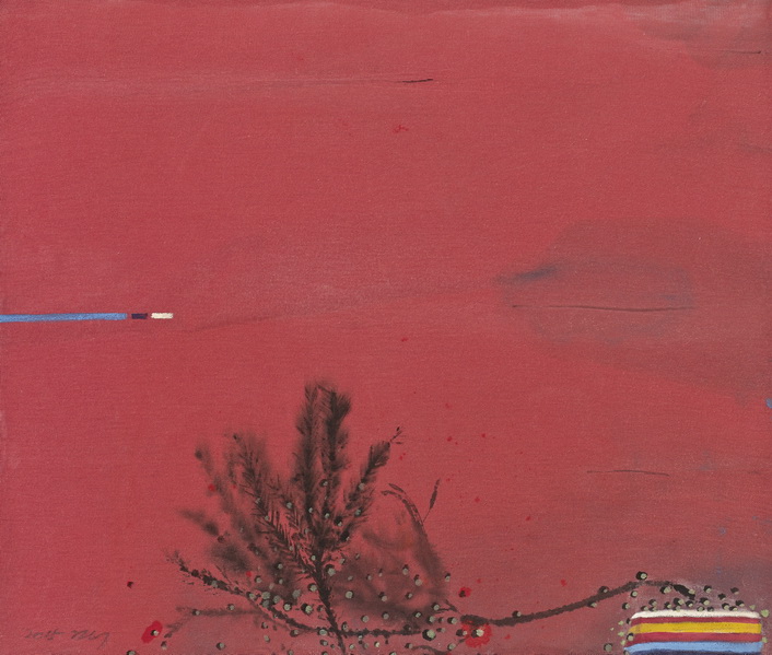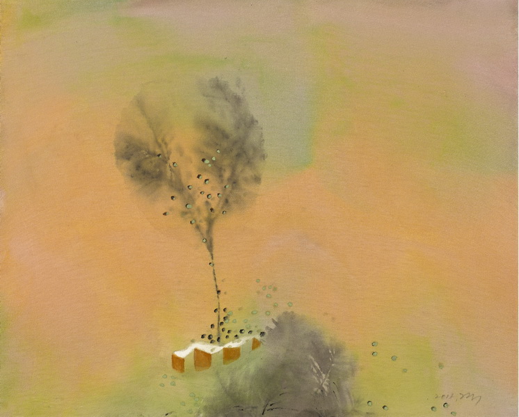 작가는 말하기를 우연히 버려진 화분이 자신에게로 온 것이 계기가 되어 지금의 그림이 탄생했다고 말한다. 그 화분 하나가 문득 자신의 유년기를 떠올려주었던 것이다. 아침이면 장독대로 감꽃이 후두둑 떨어지는 소리를 듣고 깨어나곤 했다고 말하는 작가는 온갖 꽃과 나무들이 가득한 자연 속에서 자란 그 시간대를 온전히 기억하고 있다. 그러나 지금 자신이 살고 있는 도시에서 접하는 자연은 가축화된 자연들이 대부분이다. 전선줄에 칭칭 동여매어 있는가하면 가지마다 철사로 비틀어 묶어 놓은 분재 등이 그렇다. 본래의 자연에서 벗어나 인위적으로 길들여지거나 기이하게 관리되는 나무와 화분을 보는 순간 작가는 슬픈 감정을 갖게 되었다고 한다. 그래서 생각해낸 것이 저 나무와 풀을 본래의 자연으로 되돌려 보내는 것이자 유년시절의 자연 속으로 되돌아가보는 상상이었다. 그러니 작가의 그림은 바로 그 슬픈 감정으로 빚어낸 장면이자 유년의 자연공간에 대한 기억의 이미지화인 셈이다. 그래서 어린 시절 경험했던 자연과의 추억, 시정이 안개처럼 퍼지고 햇살처럼 반짝이는 그림이 되었다. 휴식과 치유의 공간으로 돌아가고 싶은 바람이 깃든 풍경이다. 그렇게 해서 작은 화분, 나무를 연상시키는 이미지가 슬쩍 들어가고 자연에서 받은 감흥과 시정은 아련한 색채로 천을 홍건하게 적시면서 퍼져나가고 희미하고 안쓰러운 추억의 이미지들은 간소한 선과 희박한 물성을 지닌 색상으로 응고된다. 그러고 보니 나무처럼 보이는 선은 식물의 줄기를 닮았고 작은 집처럼 보이는, 점토로 붙여놓은 물체는 화분에 해당하는 것이기도 하다. 가능한 화분은 화려한 색조로 치장을 했고 나무는 어두운 먹색으로 그려놓아 대조를 이루었다.