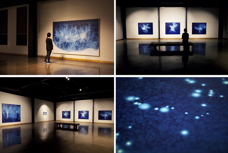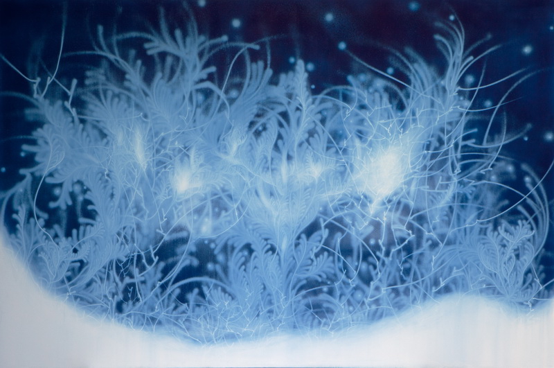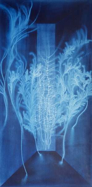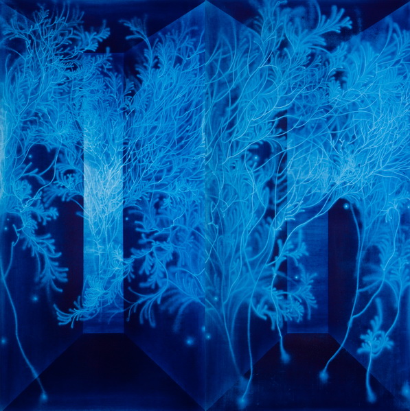 작가노트 『워터스케이프_물我一體』 워터스케이프(Water_scape)는 ‘물 풍경’으로 ‘물(水)로 그린 물(物)그림’이라는 중의적 의미를 내포하고 있다. 물은 작품의 소재, 주요 표현기법, 그리고 그 안에 함축된 의미 모두를 담는 하나의 그릇이다. 물이라는 메타포를 통하여 생명의 본질과 존재의 원형에 대한 시각적 고찰을 다룬다. 부제인 ‘물我一體’는 물과 나의 혼연일체를 뜻하는 것으로 좀 더 구체적으로는 수아불이(水我不二)를 의미한다. 주체와 객체, 관념과 현실, 물질계와 정신계 등 이 세상에 존재하는 모든 이항대립적 관계로부터 벗어나 바깥 사물과 내가 하나 되는 비분별지의 세계를 어떻게 물을 매개로 은유적으로 표현할 수 있을까? 비정형의 물을 그린다는 것은 어불성설이다. 애초에 물의 외형적 재현보다는 물이 지닌 속성(유동성, 가변성, 정명성)을 통해 생명의 본질과 존재의 원형을 시각적으로 조형화하는데 초점을 둔다. 물자체로 물을 그리는 핵심 이유이다. 가변적인 물의 속성을 극대화하기 위하여 나는 먼저 화폭을 흑연 또는 청분으로 도포한 후, 에어건에 탑재한 물을 분사하여 바탕색을 지우고 씻어내는 작화방식으로 형상을 그린다. 이는 ‘허’ 중시적 동양사상에 근거한 것으로 육안으로 보이는 현상계 너머 보이지 않는 세계에 대한 관심으로부터 비롯하여, 궁극적으로는 허와 실, 음과 양, 유와 무가 상생하는 화면을 추구한다. 보통 한 작품을 시작하면 단숨에 완성하곤 하는데, 끊임없이 흐르는 물을 컨트롤하는 최선의 방법은 그저 흐르는 물에 몸을 맡기고 물과 함께 흐르는 것이다. 조금이라도 나의 의지가 앞설라치면 선은 딱딱하고 생명성은 사라진다. 그만큼 고도의 집중력과 몰입(flow)을 요구하며, 즉흥성과 우연성은 워터스케이프의 필연적인 조형요소이다. 이성의 개입은 최소화하되 직관과 본능에 집중한다. 물과 내가 일체 되었노라고 장담할 수는 없지만 작업을 하는 내내 나는 늘 물과 땀과 눈물로 범벅이 되곤 한다. 나에게 블루는 현실적인 듯 비현실적인 색이다. 투명한 블루는 자궁처럼 평안한 감정을 주는 동시에 나를 현실 너머 어딘가로 이끄는 힘이 있다. 원초적 끌림이랄까! 푸른 공간에서 유영하며 춤을 추는 물풀은 뒬레즈의 노마디즘적 사유를 드러낸다. 뭉치고 흩어지는 가운데 풀들은 무언가 새로운 생명체를 형성하고, 이는 원초적 욕망으로써의 생성의 힘을 느끼게 한다. 리좀(rhizome)과 같이 자유로운 방향성을 띠고 흔들리며 흐르는 상태를 통해 원형적 존재에 대한 그리움과 끊임없이 탈영토화를 꿈꾸는 자아를 은유적으로 표현하고자 하였다. 모든 인욕과 인위가 사라진 순수본성 그대로의 상태, 즉 절대자유를 꿈꾸는 물풀들. 나는 과연 물인가 풀인가? 2015 송창애 갤러리선제 GALLERY SUNJAY 경상북도 칠곡군 가산면 호국로 1366 Tel. +82.54.971.8855 gallerysunjay.com [학력] 2013 Ph.D. 홍익대학교 (동양화) 2008 M.F.A. University of Oregon, 미국 (painting & drawing) 1997 M.F.A. 숙명여자대학교 (한국화) / 1995 B.F.A. 숙명여자대학교 (한국화)