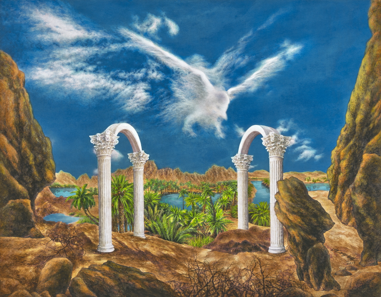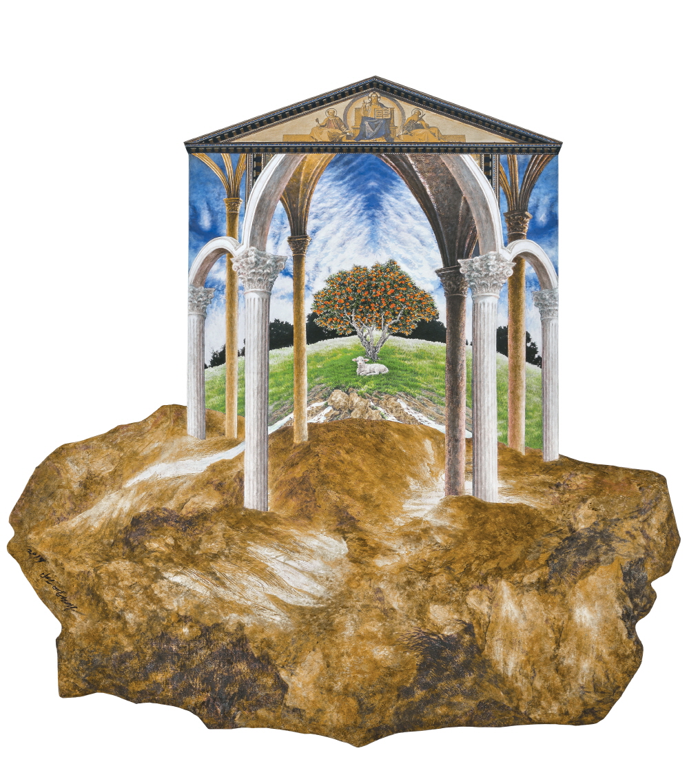 출애굽한 이스라엘 백성이 광야를 지나다 종려나무 칠십 주와 열두 샘물이 있는 오아시스를 만난 <엘림>, 스가랴 4자의 환상을 그린 <순금 등잔대와 두 감람나무>등은 성경 속의 스토리를 시각화한 작품입니다. 특히 야곱의 사닥다리의 환상을 표현한 <벧엘><흔들리지 않는 영원한 나라>는 입체적 작품으로서 오브제 형식으로 제작했습니다. 작품 속에 자주 등장하는 두 돌기둥은 야긴과 보아스를 상징하는 믿음의 기둥입니다.
