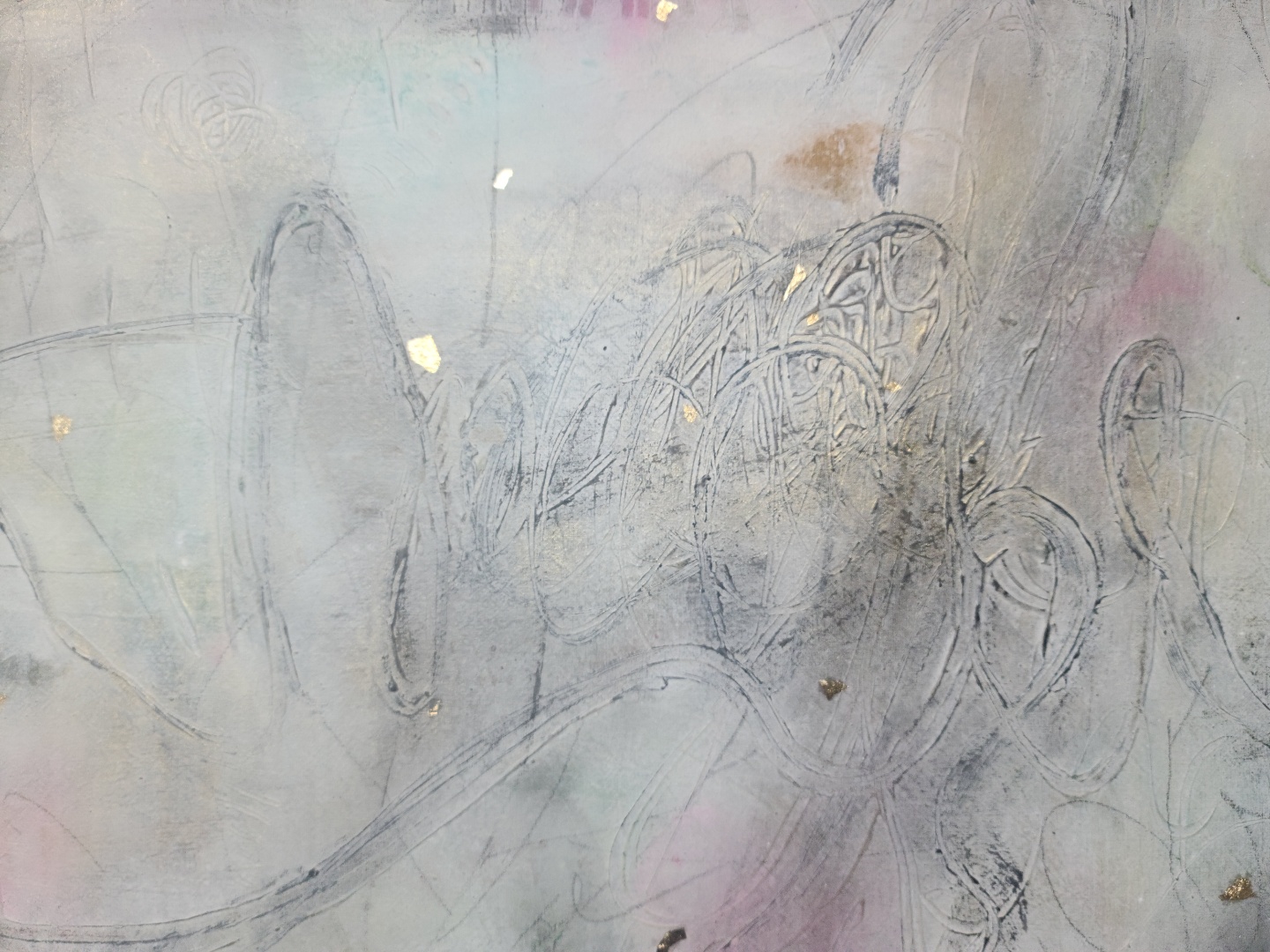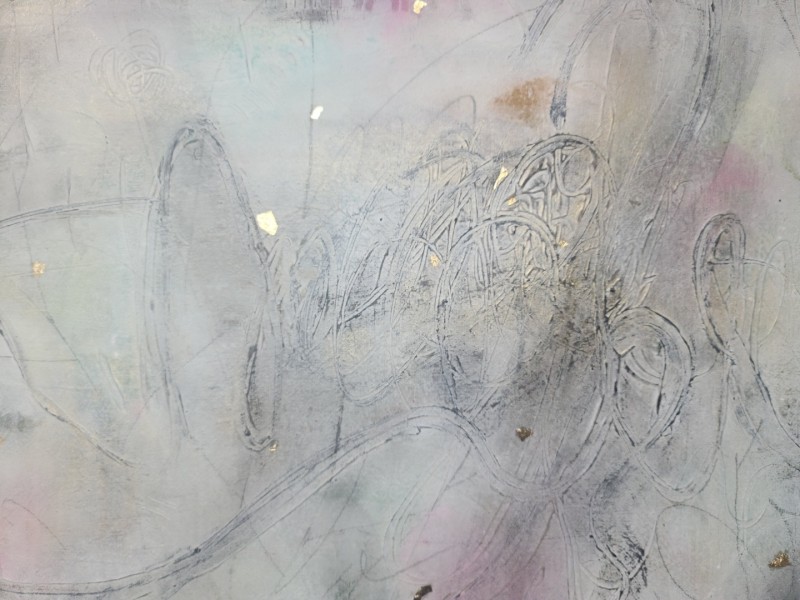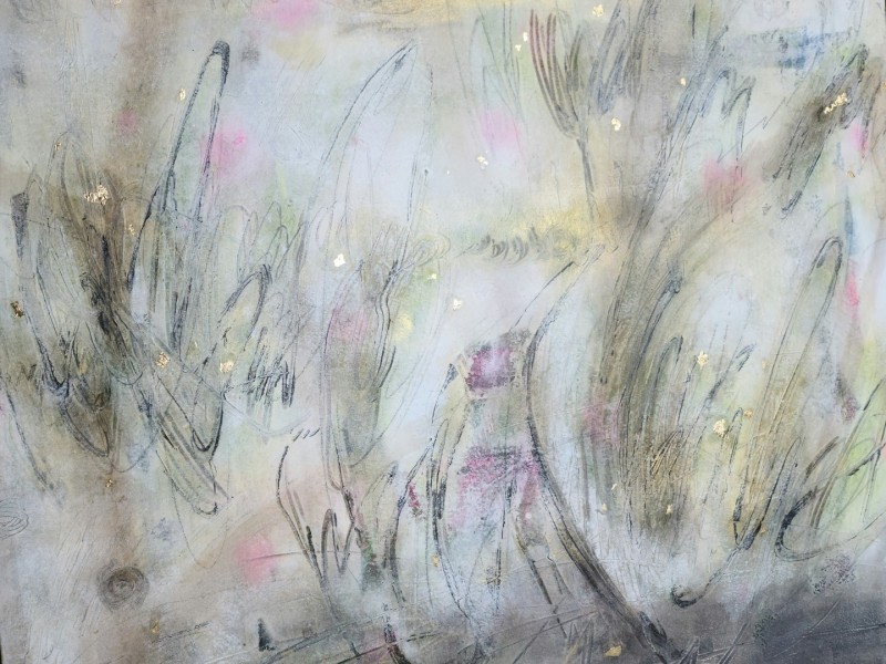 작가에 의하면 앞 뒤 작업은 거의 반반씩 소요된다. 농도로 친다면 앞면이 높지만, 물감이 쌓이는 과정이나 손이 가는 빈도수나 시간으로 친다면 뒷면이 높다. 뒷면에서 올라오는 색은 같은 색도 여러 뉘앙스로 변주된다. 시간이 걸러내는 만큼 공간도 걸러낸다. 먹지로 그어진 선들은 선명하지 않다. 구김이나 염색의 정도도 다르다. 공산품이 시간과 노동의 흔적을 지운다면, 작가는 또 다른 시간과 노동을 투여하여 그 흔적을 복귀시킨다. 바탕에서 일어나는 일은 본격적인 작업에서도 반복되어, 작품은 거듭된 시간의 켜를 덮어쓴다. 작품은 그자체가 흔적들의 연속이다. 그것은 같은 경험도 상황에 따라 기억의 강도는 같지 않음을, 기억의 강도에 따라 현재의 지각도 달라질 수 있음을 보여준다. 정사각형 틀을 가진 작품들은 마치 단자(單子)처럼 어떤 시공들을 완전한 형식의 상자 안에 담아놓은 듯한 모습이다. 가로로 긴 작품은 풍경화의 틀을 갖췄지만, 그 안에 들어있는 것들은 풍경의 요소들이다....