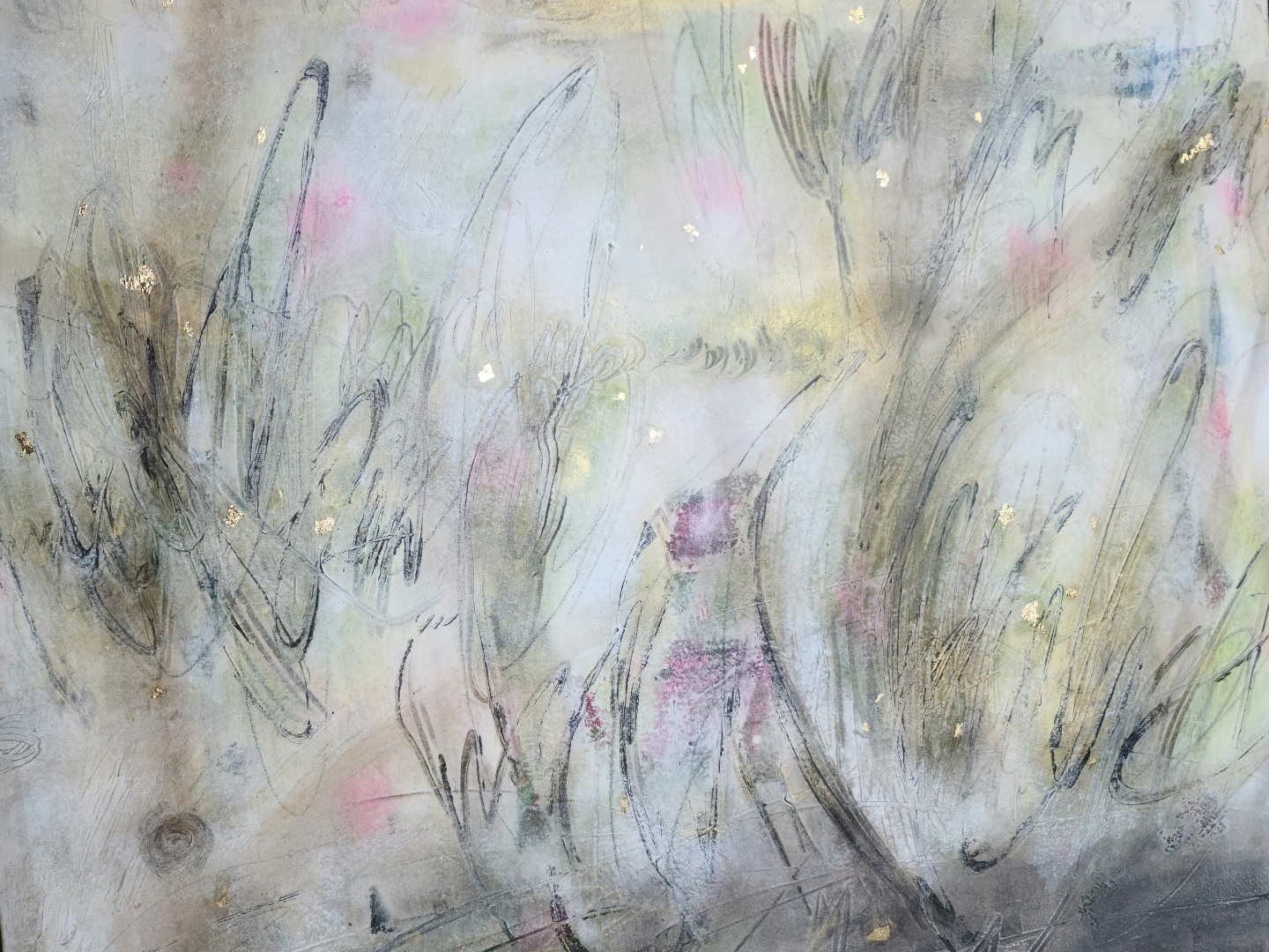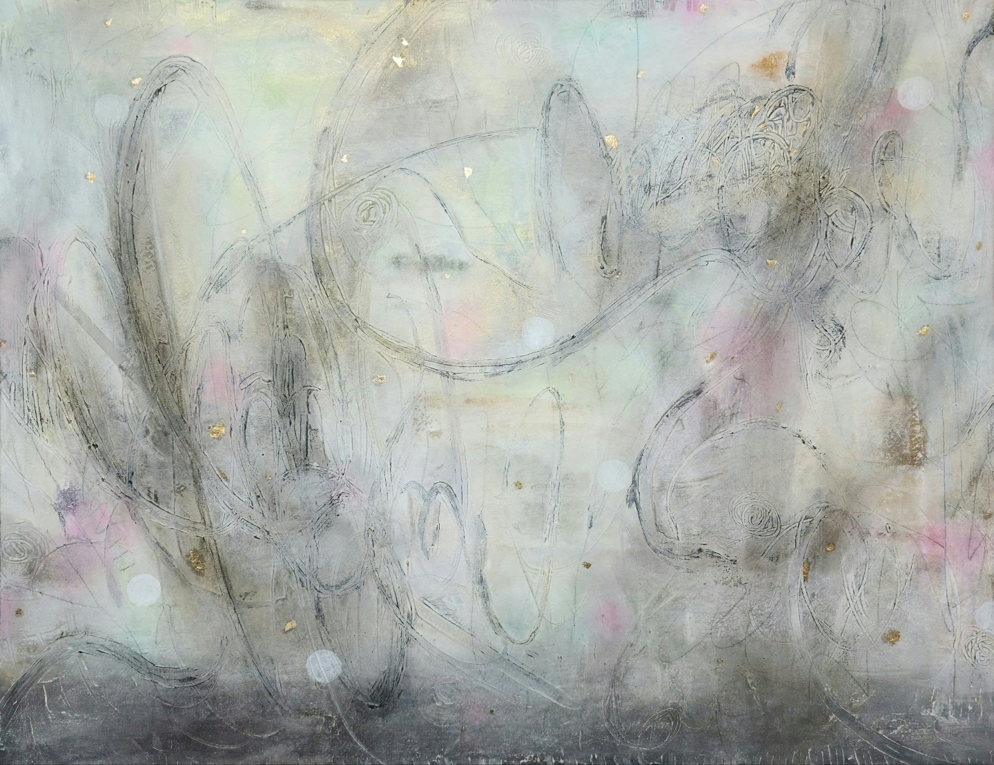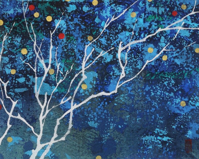 ‘공간적 개념인 지각에 비해 시간적 개념인 기억’(베르그송, 들뢰즈)의 범위는 무한하다. 기억은 얼마 전의 것부터 계통발생학적 시간대까지 거슬러 올라갈 수 있다. 아래에서 올려다본 나뭇가지들은 비록 땅에 뿌리를 둔 계통수의 이미지와 거리가 있지만, 리좀처럼 끝없이 뻗어나가는 과정에서 미시에서 거시에 이르는 시간의 그물망이 탐지된다. 다양한 선, 형, 색이 만들어내는 변화무쌍한 좌표는 기억이 활성화될 때의 뇌 속에서 일어나는 신경망부터 저 머나먼 우주에 떠있는 별자리까지 걸쳐있다. 생명에게는 일일이 경험하지 않아도 유전적으로 입력되어 있는 기억도 있을 것이다. 저 머나먼 별자리는 지금 여기의 좌표를 확실하게 해주기도 한다. 지각이 앞면이면, 기억은 뒷면이다. 김지현의 독특한 화면은 공산품인 광목을 사다가 물에 불려 빨고, 기름기 없애는 등의 작가가 직접 정련한 천 앞뒤로 모두 작업하는 방식을 통해 이루어지는데, 그것은 지각과 기억을 모두 작품에 담으려는 의지가 형식적으로 관철된 것이다.