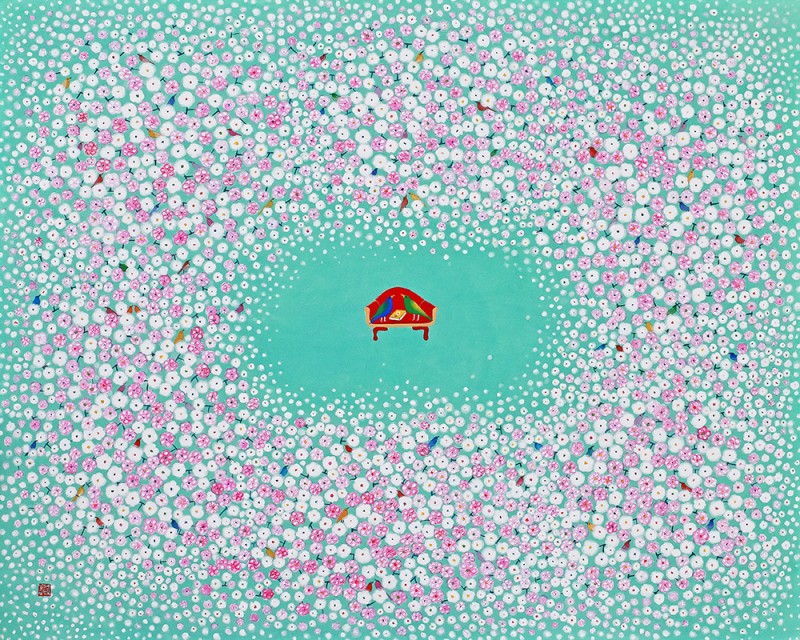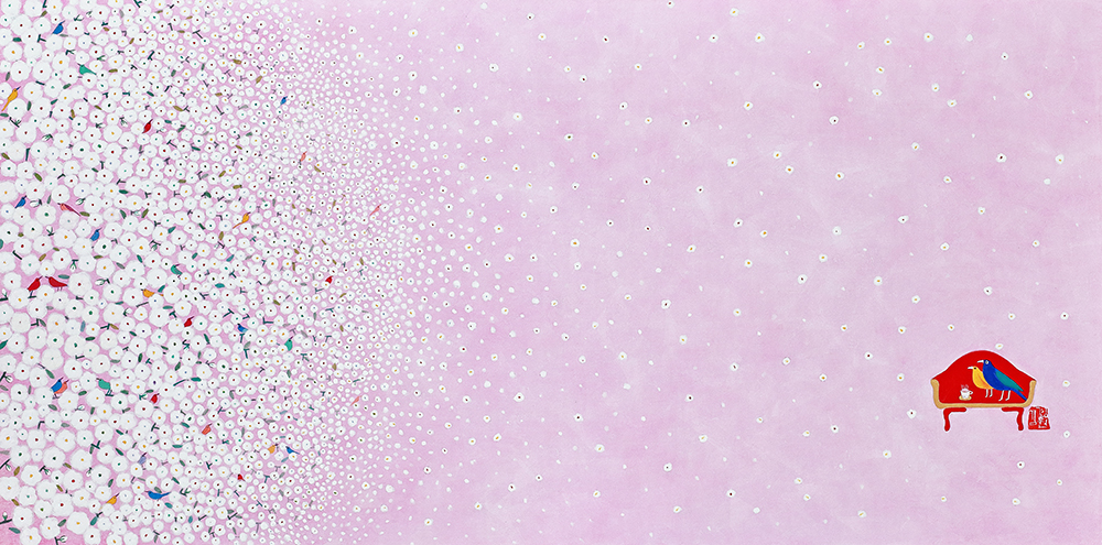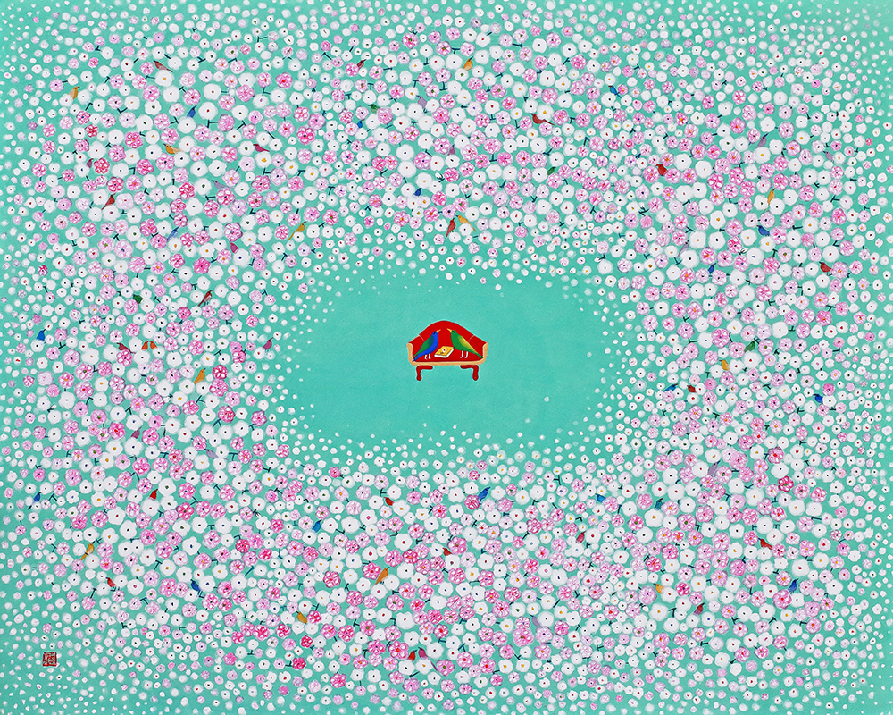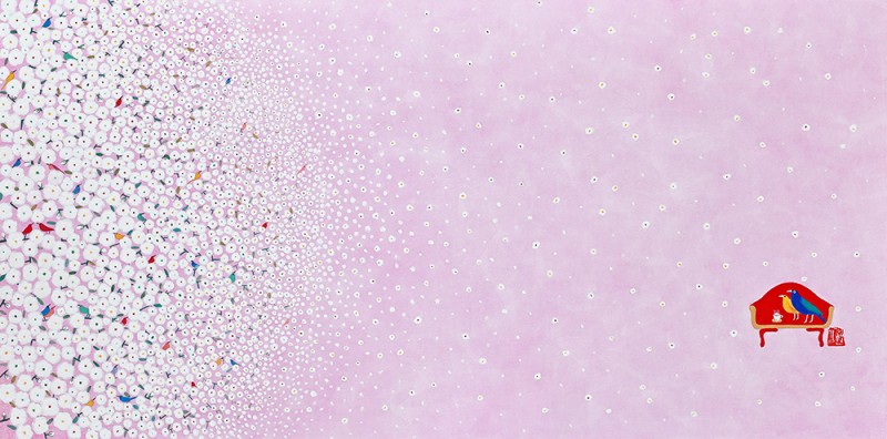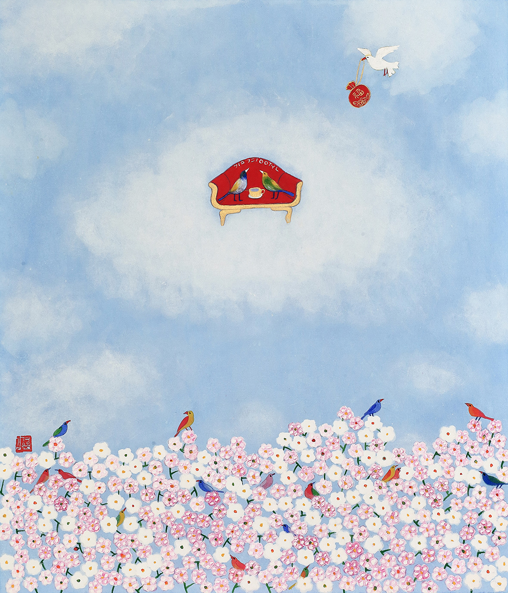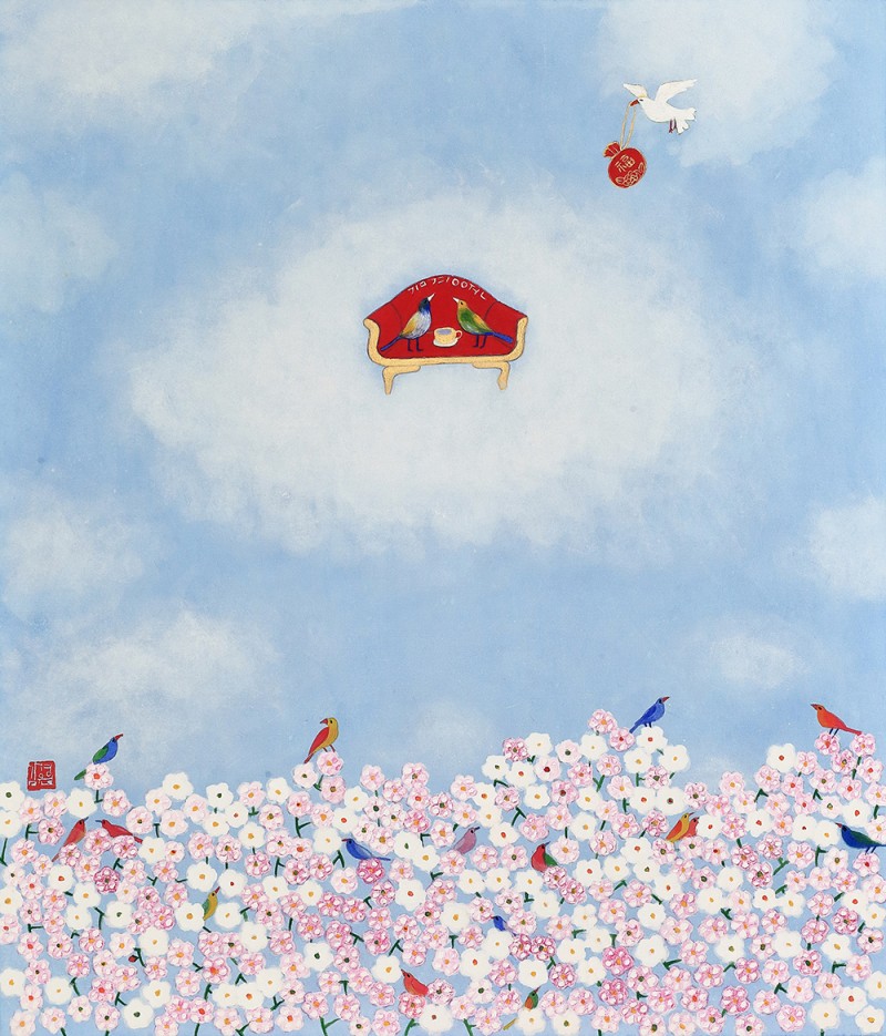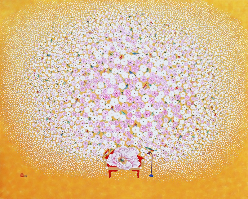 꽃과 새로 점철된 순수의 세계 우리는 흔히 꽃을 보았을 때, 새보다는 나비를 떠올린다. 호접(胡蝶: 나비의 턱살)이 꽃과 닿아 하나가 된 모습은 그윽한 향을 떠올리게 할 뿐 아니라, 공존을 통해 질서와 조화를 구현하기 때문이다. 내 것도 없고 네 것도 없는 공존의 세계, 그것이 꽃과 나비를 하나로 보이게 만든다. 하지만 작가의 세계 속에 나비는 없다. 향이 아닌 개체로서 모인 여러 마리의 새가 자신의 목소리를 내며 예쁘게 지저귀는 모양새다. 꽃과 새, 화조(花鳥)라 불리는 이 묘한 조합은 하나이기 보다는 둘을, 전체이기 보다는 자신을 이야기한다. “꽃은 꽃답게 새는 새답게” 꽃과 나비처럼 나를 버리고 무아(無我)의 경지에 들어가는 좌망(坐忘)을 추구하기보다, ‘지금-여기’의 나를, 참고 버티느라 숨겨왔던 순수한 동심을 갈망하는 것이다. 그럼에도 동화 같은 예쁜 화면은 보는 이로 하여금 경계심을 지우고 그림 속 세계로 걸어오라 손짓한다. 축적된 삶의 경험들은 열 번 스무 번 쌓여가는 중첩된 안료 속에 녹아들어 ‘작가의 노동’을 ‘아름다운 환희’로 전이시킨다. 전통안료를 유화의 마띠에르처럼 올려낸 섬세한 붓질은 힘겨운 삶을 견뎌낸 후 되찾은 젊은 날의 가능성을 담았다. 그래서 작가의 화면은 능숙한 솜씨를 사뿐히 즈려 밟은 채, 아이 같은 순수의 세계를 표상한다.
