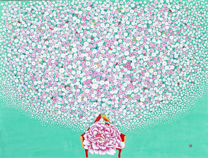 현실과 맞닿은 이상화된 세계 최근 작업에서는 기존 작업에서 볼 수 없던 두 가지 요소가 가미되었다. 첫째는 개별적으로 흩어져 있던 꽃이 통일감 있는 하나의 형상을 이루었다는 것이다. 의인화된 문인의 시각을 현대화된 음율(새가 시를 읊조리는 느낌)로 표방한 느낌이다. 색감 역시 전통 오방색(五方色)을 현대화시킨 모습으로 재해석 되었다. 공허하고 슬프다는 것은 참고 살아온 인생이었음을 반증한다. 작가는 2014년의 개념화된 <추억의 정원>시리즈에서 지우고 지워내는 작업을 보여준 바 있다. 기존 작업이 슬픈 정서를 녹여냈다면, 현재 작업은 기쁘고 유려하다. 작가는 유년시절 집에 놓여 있던 모란꽃 장신구들과 앞마당에 피어있던 작약의 화려함을 기억해냈다. 하나의 꽃으로 형상화된 작은 꽃의 세계는 견뎌온 세월을 향한 긍정적인 보상을 의미한다. 그래선지 작품은 미세한 부분까지 작가의 마음을 녹여낸다. 들꽃(야생화)에서 매화로, 좀 더 화려한 꽃으로, 앞으로 작가는 삶을 변화시키고자 하는 의지를 꽃의 변화상을 통해 드러낼 것이다. 둘째는 작품 안에 일종의 데페이즈망(dépaysement; 전치(轉置), 전위)이 사용된다는 점이다. 왕좌(王座)를 떠올리는 화려한 의자 위에 새들은 다채로운 모습으로 내려앉아 화면 속 꽃의 세계를 바라본다. 화려한 의자가 등장했다는 것은 왕의 귀환과 같이 ‘가장 아름다운 시절(La belle époque)’을 요청하는 동시에, 휴식 같은 여유를 취하고자 하는 결연한 의지를 보여주는 것이다. 시인 로트레아몽(Lautréamont)은 꽃·새·의자 등을 표현한 초현실적 기법에 대해 ‘재봉틀·박쥐·우산과 같은 전혀 관계없는 물체들이 해부대 위에서 우연히 만난 듯한 아름다움’이라고 표현한 바 있다. 낯익은 물체를 일상적인 질서에서 떼어내 이처럼 뜻하지 않은 장소에 놓는 행위, 바로 이러한 우연성은 달리의 시계처럼 우리의 시·공간을 경이와 신비에 가득찬 무의식의 세계로 인도한다. 작가의 마음 속 깊이 잠재해 있던 무의식의 세계를 해방시키는 창구, 의자는 우리에게 다른 삶으로 인도하는 하나의 탈출구인 셈이다. “그림을 그리는 과정은 나 자신을 발견해가는 과정이었습니다. 작품을 하면서 위안을 받았던 것처럼, 내 그림을 보는 사람들이 작품 속 의자 안에서 편히 쉬어 갈 수 있기를 바랍니다.” - 작가노트 중에서