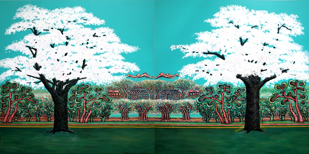 작가는 자신이 그리는 자연풍경이나 전통사회의 고향 풍경, 한국인이 이상적으로 떠올려주는 이상적 장소를 이른바 정토라 부르며 그곳에서 이른바 ‘보살의 상’을 발견한다. 정토란 ‘부처와 보살이 사는 곳으로, 번뇌의 구속에서 벗어난 아주 깨끗한 세상’인데 작가에게는 자연이 그렇고 추억어린 고향의 장소가 그러하며 삼라만상이 모두 그러한 맥락 안에서 순환한다고 보는 것 같다. 만다라란 기본적으로 우주를 상징하며 신들이 거할 수 있는 신성한 장소이자 우주의 힘이 응집되는 장소라고 볼 수 있을 텐데 작가는 분명 정신적으로 만다라의 중심으로 들어가 전진하고자 하는 차원에서의 그림을 시도하는 것 같다. 수많은 색과 선이 얽혀 있어 있고 특정 형상을 빌어 출몰하는 그림은 결국 작가의 만다라적 세계관이 투사된 조형어법에 근간해서 이루어지고 있다고 본다. 모든 살아있는 존재 안에서, 사물의 피부위에서 정토와 보살의 상을 발견하고 그곳에서 구원을 추구하는 마음의 극진한 상태를 추구하고 있는 것이 작가의 근작이라는 생각이다