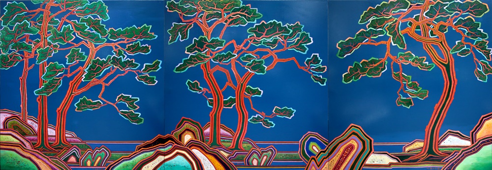 작가가 평생 추구해온 것은 결국 극락세계였다. 이른바 ‘평정심의 정토’였다. 그것들은 평범한 자연풍경 속에서, 추억 속 유년의 풍경 안에서, 한국인이 지닌 보편적인 경험의 자장 안에서도 마구 솟아난다. 그 추억의 형상과 색채들은 마음속에서 걸러내고 단축된 선과 색의 촘촘하고 복잡하게 얽힌 어울림 속에서 유기적으로 얽혀 빛을 발한다. 우리 한국인의 미의식의 지층에 깊숙하게 자리한 색채에 대한 감각의 지평을 거느리면서 출몰하는 그런 정토에의 도상화 작업이다. 그래서 작가가 즐겨 그리는 산과 바위, 달과 해, 사람 및 나무와 꽃, 집과 대나무 등은 한국인에게 매우 친숙한 도상이자 일정한 질서 속에서 순환을 거듭하는 것들이고 영원과 불멸, 이상적인 것들이기도 하다. 마치 십장생이나 민화, 불화, 혹은 우리네 옛 그림에서 흔히 접하는 풍경이 연상되기도 한다. 사계절의 변화와 시간의 찰나적인 흐름 속에서 소멸하는 것이자 동시에 거듭 환생하는 것들이며 한국인의 심상의 기억 속에 잠재된 원형으로서의 풍경, 공간이미지이자 극락이자 정토요 보살의 이미지에 다름 아니다.