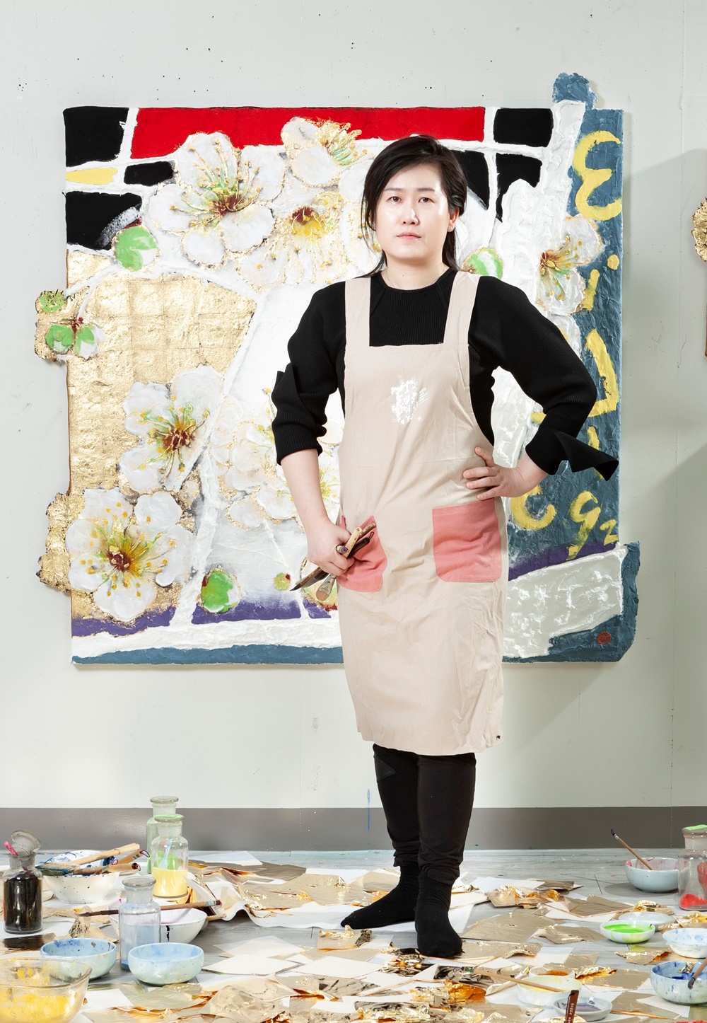 서수영의 금채화金彩畵, 매화를 품은 달항아리 이태호 명지대학교 초빙교수/서울산수연구소장 1. 색다른 맛이다. 매화와 나비가 화면 가득 백자 달항아리와 엇비슷이 어울려 있다. 올해 신작으로 선보인 서수영의 <달항아리, 매화를 품다>는 그동안 쌓아온 회화 경향과 살짝 다르고, 화면의 형태나 구성부터 새롭게 다가온다. 서수영은 벌써 20년을 훌쩍 넘는 화력을 쌓았단다. 스무 번 이상의 국내외 개인전, 여러 유명 평론가들의 전시평, 페트론이나 수장처의 확산을 통해서 한국화 분야에서 채색화가로 중진급 위상을 다져왔다. 전통회화 물감인 돌가루 석채(石彩)를 주로 쓰며 금(金) 활용을 병행하는 ‘금채화金彩畵’ 작업에 꾸준히 매진해온 작가이다. 전통 채색화인 금채화는 작업공정이 까딸스런 편이다. 석채 안료를 갈고 개고, 접착제인 아교나 백반과 아교를 혼용한 교반수(膠礬水)를 조절해야 한다. 금을 보완할 경우, 금가루의 니금(泥金)이나 얇은 판막으로 늘려 쓰는 금박(金箔) 기법 역시 재료에 대한 이해와 숙련이 필요하다. 그런 탓인지 미술대학에서 한국화과나 동양화과를 졸업하고도 먹이나 석채보다 아크릴릭 물감을 쓰면서 서양화 방식으로 전환하는 경우가 허다한 편이다. 2. 서수영은 박사과정에서 금을 사용한 석채 그림 ‘금채화’의 역사를 돌아보고, 제작공정을 단련했다. 그 결과, 「한국회화에서의 금(金) 표현기법 연구」(동덕여자대학교 대학원, 2011)로 박사학위를 받았다. 금을 사용하는 이짚트 고대문화부터 동서양 미술사를 두루 훑었다. 중국과 일본, 한국의 전통적 금채 방식을 집중해 연구했고, 일본에 비교적 잘 유지된 기법도 눈여겨 실습했다. 변치 않는 그림 재료로서 석채와 금의 영원성을 재발견하고, 고려 불화부터 조선 궁중회화까지 한국의 전통 금채화 기법을 되짚으며 연마했다. 먹과 더불어 채색의 고귀함을 뽐내는 전통 채색 그림을 통해 독보적 한국화가로 뿌리를 단단히 내렸다고 여겨진다. 최근 10년 새 궁중 인물화나 소재를 즐겨 선택했고, 작품 제목처럼 ‘황실의 품위’라는 별명마저 얻은 모양이다. 2000년 이후 서수영은 분채(粉彩)에서 석채(石彩)로 작업의 중심을 옮기며 돌가루 분말이 자아내는 아름다운 색감에 매료되었다. 그리고 니금이나 금박으로 금의 효과를 다채롭게 활용했다. 보는 위치에 따라 반짝거림과 밝기가 변하는 금색과 달리 석채는 더욱 선연하고 깊은 색상을 발한다. 무엇보다 가벼이 들뜨기 쉬운 원색조를 안정감 있게 처리한 점은 서수영 회화를 빛나게 한다. 고려 불화처럼 어두운 색조의 바탕질은 물론이려니와, 이에 어울리는 전통방식의 도침 장지 다루는 법을 이겨낸 탓이다. 실제 서수영은 개인전 때마다 다양한 화재와 작품세계를 전개해왔다. 20여 년의 작업을 훑어보니, 전체적으로 전통을 기반 삼으며 늘 새로운 방식을 시도하고 드러내었다. 배경에서 이는 몽환적 분위기로 주제를 떠올리는 방식으로 자신의 개성을 일찍부터 각인시켰다.
