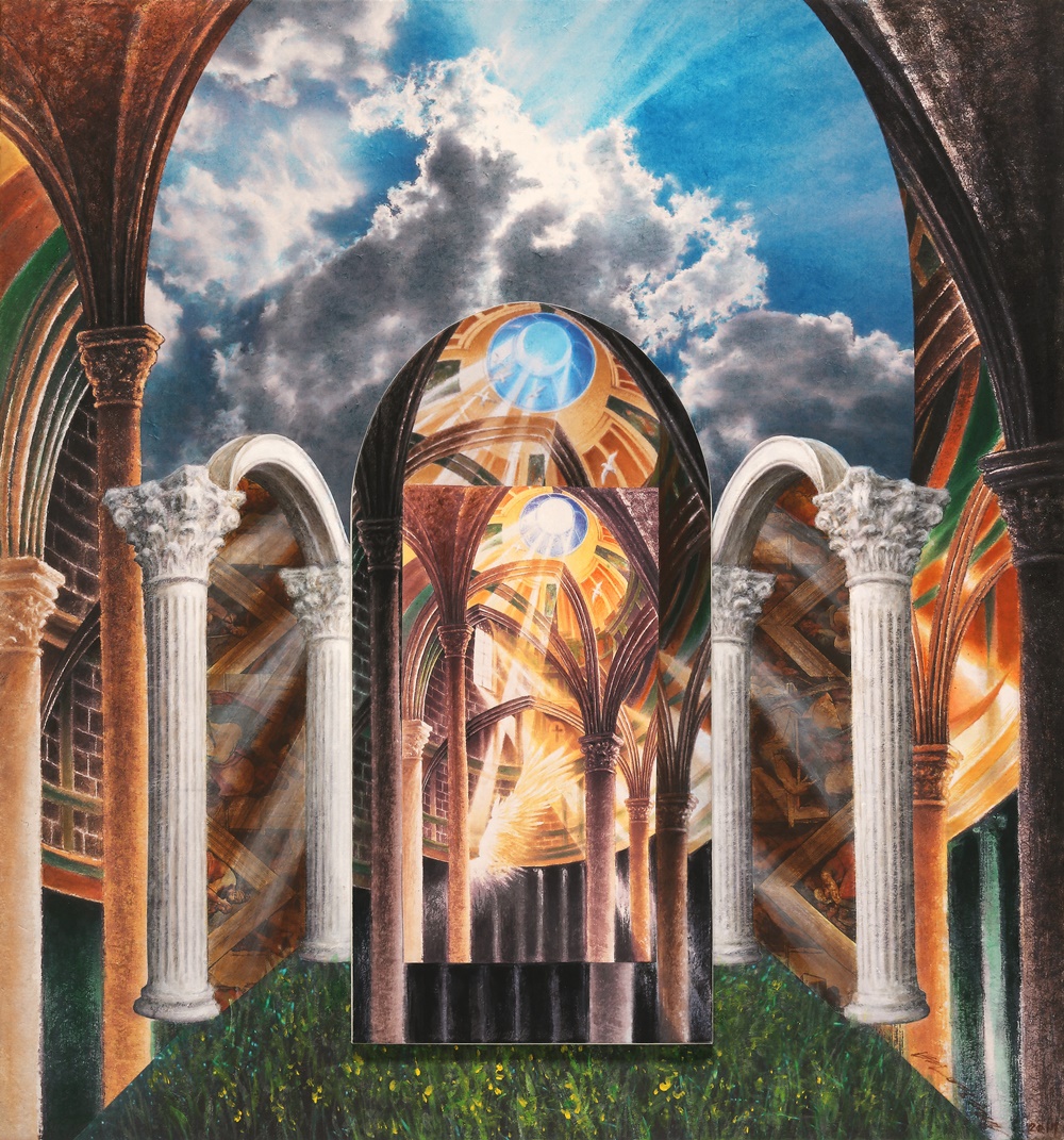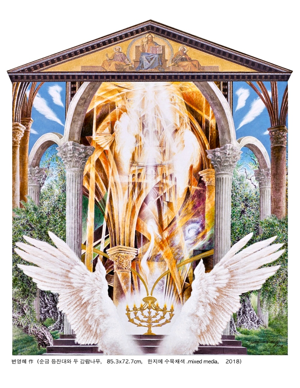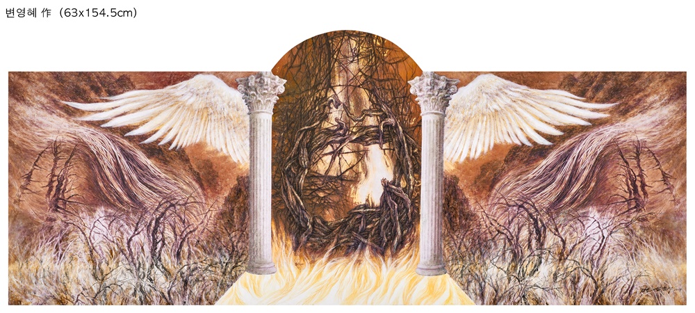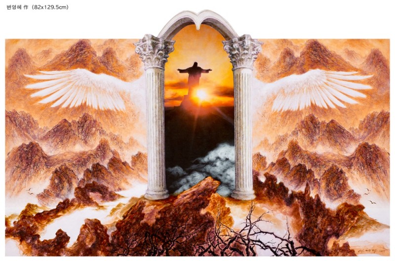 신적인 임재의 표현 2017년 그는 <하나님의 영광>이란 연작을 새로 선보였다. <야긴과 보아스>는 초현실적인 공간 속에서 하나님의 임재와 영광을 표현한 것으로 지상과 천상을 하나의 공간에 실어낸 웅장한 스케일을 통해 하나님의 초월성과 내재성을 함께 보여준다. 하나님의 영광과 관련한 다른 작품으로 <불붙은 떨기나무>(Burning Bush, 2017)가 있는데 이 작품은 인간을 구원하시려고 십자가에 달리신 예수님의 고난과 호렙산의 불붙은 떨기나무의 불꽃 가운데 임재하신 하나님의 권능, 그리고 광야같은 세상의 각박함과 곤고함 속에서도 우리와 함께 하시는 하나님 품의 한량없는 사랑을 각각 형상화한 것이다. <광야의 숨결>(2017)도 이와 비슷한 구도를 취한다. 약간 다른 점이 있다면 하늘의 빛과 성령의 충만이 곁들어져 있다는 사실이다. 이 그림 가운데 작가는 성부와 성자, 그리고 성령님을 함께 표현하고 있는데 이렇듯 삼위일체의 신비를 작품 안에 담는 것은 흔치 않는 일이다. 언어로 해낼 수 없는 것을 시각적 이미지로 나타냄으로써 하나님 나라에 대한 우리의 사고와 상상력을 북돋아준다. <영생의 빛-언약궤>(2018)는 하나님의 임재를 나타낸 작품으로 웅장한 날개 사이로 두 그룹의 날개로 가리워진 직육면체의 언약궤(ark of the covenant)가 보인다. 그리고 그 안에는 십계명을 새긴 두 돌판과 ‘만나’ 항아리, 아론의 싹 난 지팡이가 들어 있다. 언약궤로부터 나오는 강렬한 빛이 주위를 진동시킬 뿐만 아니라 성전을 가득 채우고 있는데 작가는 언약궤를 통해 하나님의 거룩한 처소를 생생하게 묘출하려고 했다. 신적 임재를 이렇게 실제적이며 감명 있게 표현한 작품을 찾아보기 힘들 것이다. 주님을 사모하는 그의 심경이 투영된, 두렵고 떨리는 마음으로 제작한 대표작이다. ‘신앙의 여정’을 묘출한 작품으로서 <구원의 산성>(2017)은 믿음생활을 하며 최종적인 지점에 도달하는 영적인 도정을 화폭에 담아낸 것이다. 존 번연의 <천로역정>이 인간 영혼의 갈등과 유혹, 고난과 최종적인 구원을 알레고리적으로 묘사하였듯이 이 작품 역시 영혼의 갈등과 유혹, 고난과 구원을 시각적으로 압축해서 표현하고 있다. 작가는 화면 상단에 말씀을 선포하는 그리스도를 제시함으로써 천국의 도성이 신앙 여정의 최종 목적지임을 암시하고 있다. 변영혜가 다면적인 구성과 초자연적인 세계, 환상적인 이미지를 도입하는 것은 시각적 이미지를 통해 불가촉, 불가시의 영적 세계를 알려주고자 하는 것이다. 변영혜는 복음을 출중한 예술적 기량으로 풀어냄으로써 현대 기독교 미술을 펼쳐가고 있을 뿐만 아니라 소명을 지닌 작가로서 귀감이 되고 있다. 그에게 예술은 신앙 가운데서 더욱 풍성함을 얻고 또한 신앙은 삶에 생명과 활력을 불어넣는 부스터 같은 것으로서 작용하고 있다. 예술이 영원을 만날 때보다 형형(炯炯)하고 찬란한 순간도 없을 것이다. 안동대 미술학과 교수, 미술평론가 서 성 록