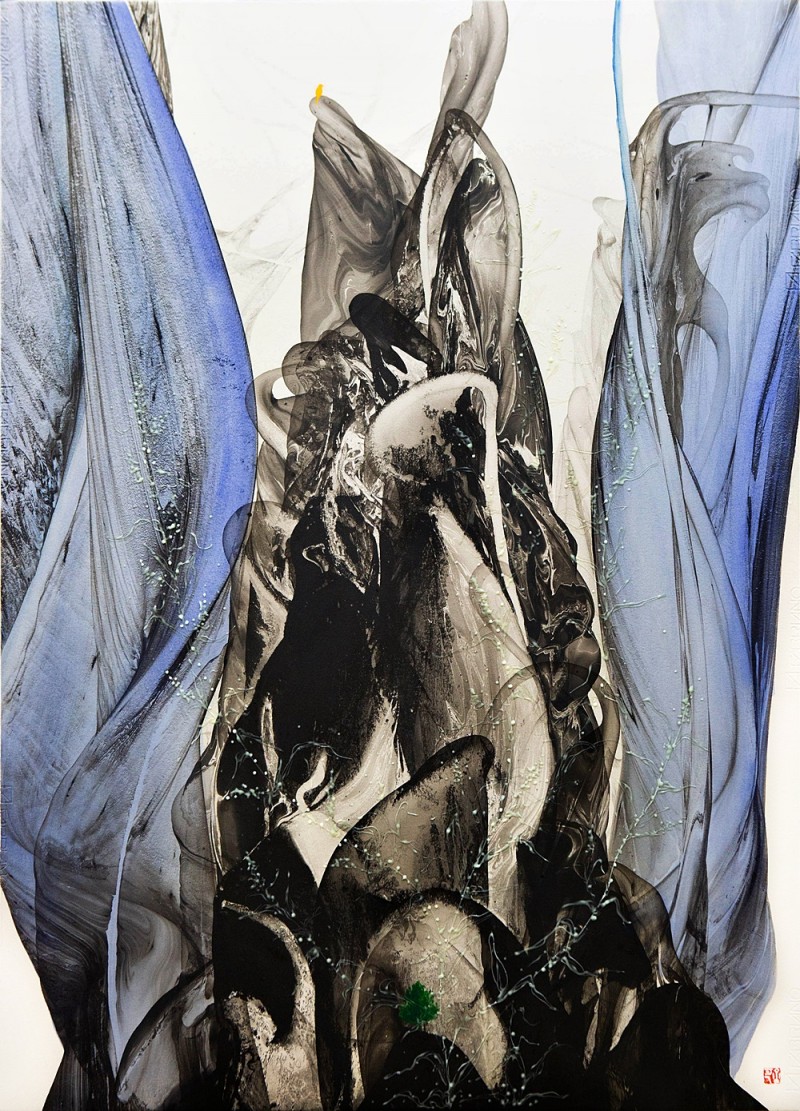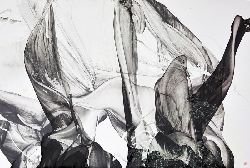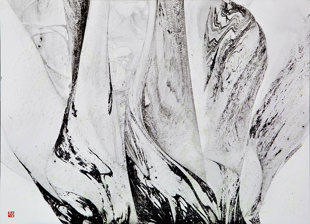 추상으로 드러난 산수풍경은 이러한 정경을 품고 찰나적으로 태어난다. 마블링 기법은 순간의 시간으로 형태를 잡는다. 아주 빠른 속도로 형상을 만들어낸다. 순간으로 영원한 생명성을 질문한다. 긴 영겁의 시간들이, 지나간 시간의 풍경들이, 찰나적 행위로 드러난다.