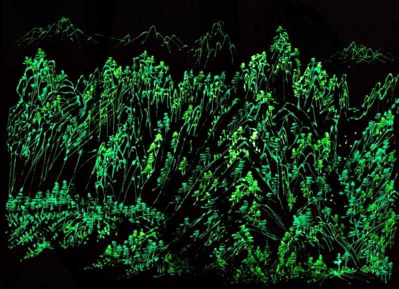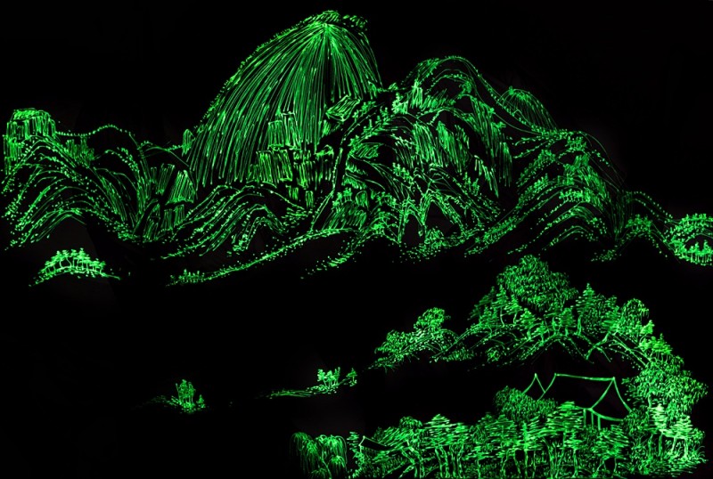 즉 하나의 화면에 두 가지 기법의 풍경을 조합하는 것이다. 흥미로운 것은 야광물질로 그려진 세밀한 산수풍경은 어둠속에서만 감상이 가능하다는 것이다. 밝은 햇빛이 저물고 어둠이 깔리면 서서히 그 빛이 살아나 장엄한 산수풍경이 드러난다. 낮에 보았던 추상의 풍경들은 어둠속에서 실제적인 그 자체의 모습을 드러낸다.