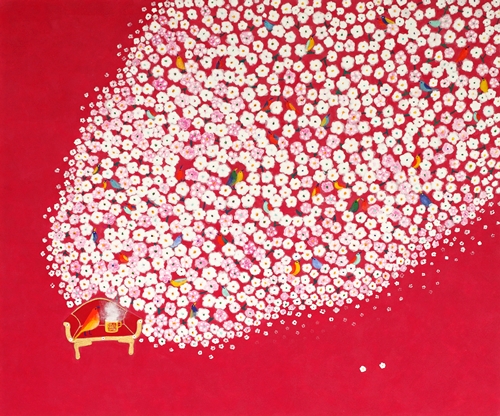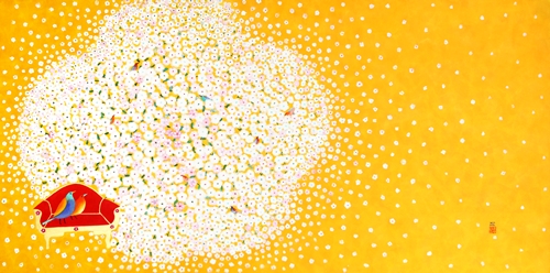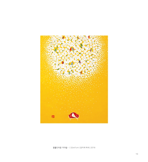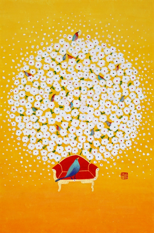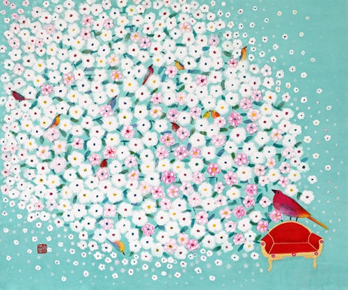 현실과 맞닿은 이상화된 세계 최근 작업에서는 기존 작업에서 볼 수 없던 두 가지 요소가 가미되었다. 첫째는 개별적으로 흩어져 있던 꽃이 통일감 있는 하나의 형상을 이루었다는 것이다. 의인화된 문인의 시각을 현대화된 음율(새가 시를 읊조리는 느낌)로 표방한 느낌이다. 색감 역시 전통 오방색(五方色)을 현대화시킨 모습으로 재해석 되었다. 공허하고 슬프다는 것은 참고 살아온 인생이었음을 반증한다. 작가는 2014년의 개념화된 <추억의 정원>시리즈에서 지우고 지워내는 작업을 보여준 바 있다. 기존 작업이 슬픈 정서를 녹여냈다면, 현재 작업은 기쁘고 유려하다. 작가는 유년시절 집에 놓여 있던 모란꽃 장신구들과 앞마당에 피어있던 작약의 화려함을 기억해냈다. 하나의 꽃으로 형상화된 작은 꽃의 세계는 견뎌온 세월을 향한 긍정적인 보상을 의미한다. 그래선지 작품은 미세한 부분까지 작가의 마음을 녹여낸다. 들꽃(야생화)에서 매화로, 좀 더 화려한 꽃으로, 앞으로 작가는 삶을 변화시키고자 하는 의지를 꽃의 변화상을 통해 드러낼 것이다. 둘째는 작품 안에 일종의 데페이즈망(dépaysement; 전치(轉置), 전위)이 사용된다는 점이다. 왕좌(王座)를 떠올리는 화려한 의자 위에 새들은 다채로운 모습으로 내려앉아 화면 속 꽃의 세계를 바라본다. 화려한 의자가 등장했다는 것은 왕의 귀환과 같이 ‘가장 아름다운 시절(La belle époque)’을 요청하는 동시에, 휴식 같은 여유를 취하고자 하는 결연한 의지를 보여주는 것이다. 시인 로트레아몽(Lautréamont)은 꽃·새·의자 등을 표현한 초현실적 기법에 대해 ‘재봉틀·박쥐·우산과 같은 전혀 관계없는 물체들이 해부대 위에서 우연히 만난 듯한 아름다움’이라고 표현한 바 있다. 낯익은 물체를 일상적인 질서에서 떼어내 이처럼 뜻하지 않은 장소에 놓는 행위, 바로 이러한 우연성은 달리의 시계처럼 우리의 시·공간을 경이와 신비에 가득찬 무의식의 세계로 인도한다. 작가의 마음 속 깊이 잠재해 있던 무의식의 세계를 해방시키는 창구, 의자는 우리에게 다른 삶으로 인도하는 하나의 탈출구인 셈이다.