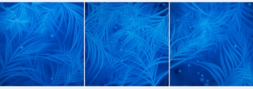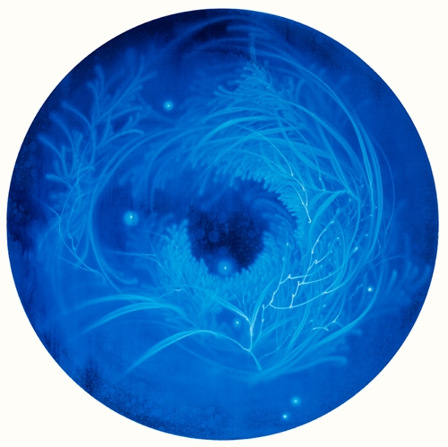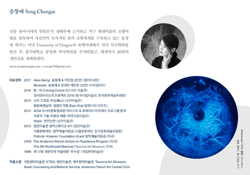 "이수관지以水觀之란 물로써 세상을 바라보다" 는 송창애의 예술세계를 관통하는 핵심사상이다. 물은 모든 작품의 소재이자 주된 표현기법, 그리고 그 안에 함축된 의미를 담는 하나의 그릇이다. ‘워터스케이프 waterscape’ 시리즈는 '물로 그린 물 그림'으로 물이라는 메타포를 통한 생명의 근원과 본질, 그리고 존재의 원형에 대한 직관적, 감각적 경험의 산물이다. 흐르는 물을 분사하여 화면의 바탕색을 지우고 씻어내는 방식으로 형상을 만드는 '물 드로잉 water drawing' 기법은 송창애 작가만의 맑고 투명한 독자적 조형세계의 근간이다. ‘허虛’를 중시하는 동양사상에 바탕을 둔 이러한 조형어법은 수아일체水我一體에 의한 허실상생虛實相生의 현대적인 조형적 구현이라 할 수 있다. ‘Waterscape_무가보주無價寶珠’는 우리 모두가 태어날 때 지니고 있는 보배구슬을 은유한다. 적막하고 짙푸른 심해 속에서 피어오르는 맑고 영롱한 물꽃은 불완전한 존재의 완전성에 대한 원초적 그리움이자 본성회귀에 대한 표상이다. ‘Isugwanji (以水觀之)’, which means ‘Looking at the world through water’, is a core idea that passes through the entire artworks of Chang-Ae Song. Water is not only a material for all her works, but also a creative expression technique. Furthermore, water is a vessel containing her conceptual and emotional implications in it. Since her artworks are drawings with a material of water, her waterscape series is a product of intuitive and sensory experience of the origin and nature of life for her, which envisions the prototype of existence through the metaphor of water. Her expression technique called 'water drawing', is creative since she creates images by directly spraying flowing water to erase and wash the background color. It is the basis of her original artworks since this formative method is based on the oriental philosophy, which emphasizes 'Huh(虛)' which means empty space in mind, space, and time. With her own original expression technique, she intends to express this oriental philosophy as a modern formative realization of traditional concept. 'Waterscape_ Mugaboju (無價寶珠)' is a metaphor for the intrinsic value of each of us as we are born. Therefore, her artworks symbolize the primitive nostalgia for human nature that craves the perfectiveness of human beings by expressing water flowers that blossoms in deep oceans. |