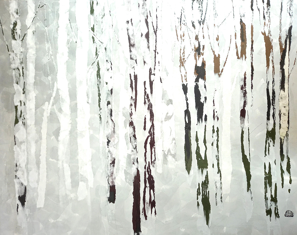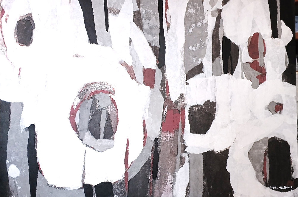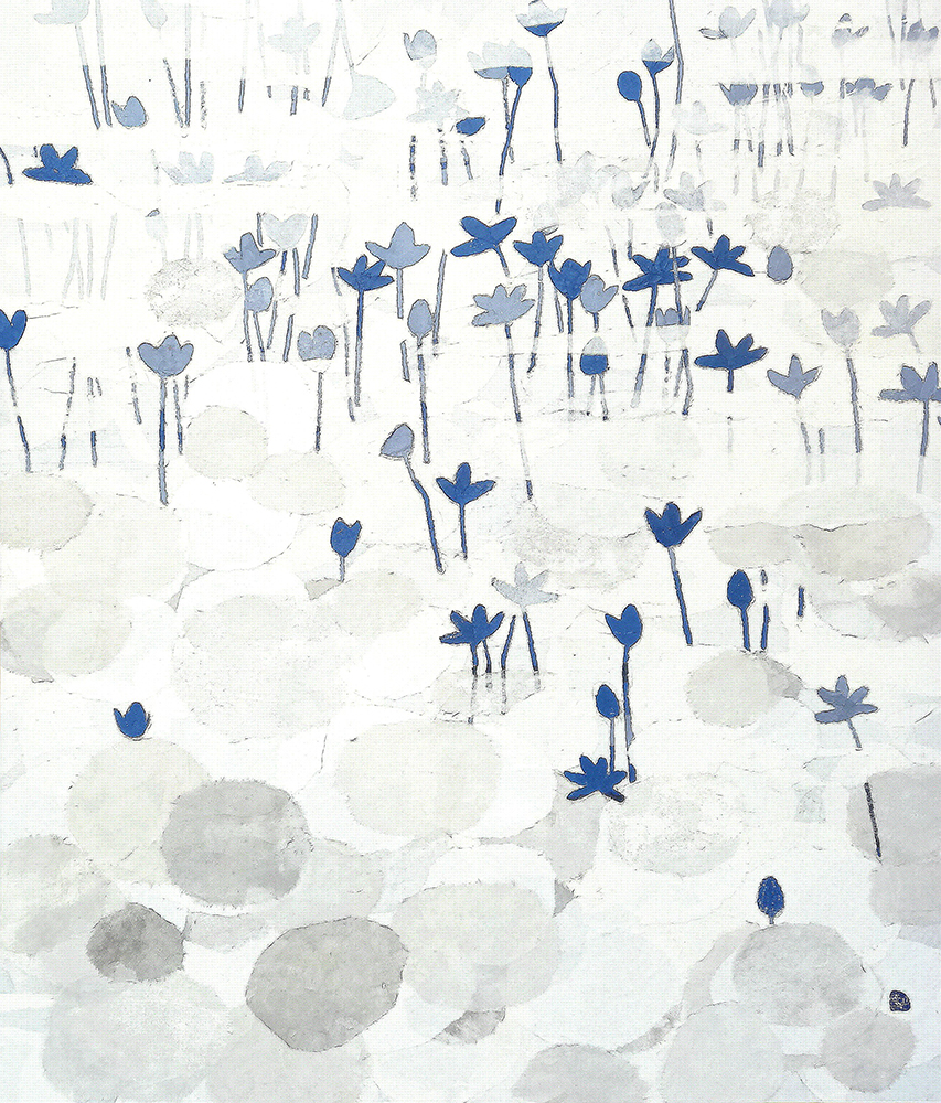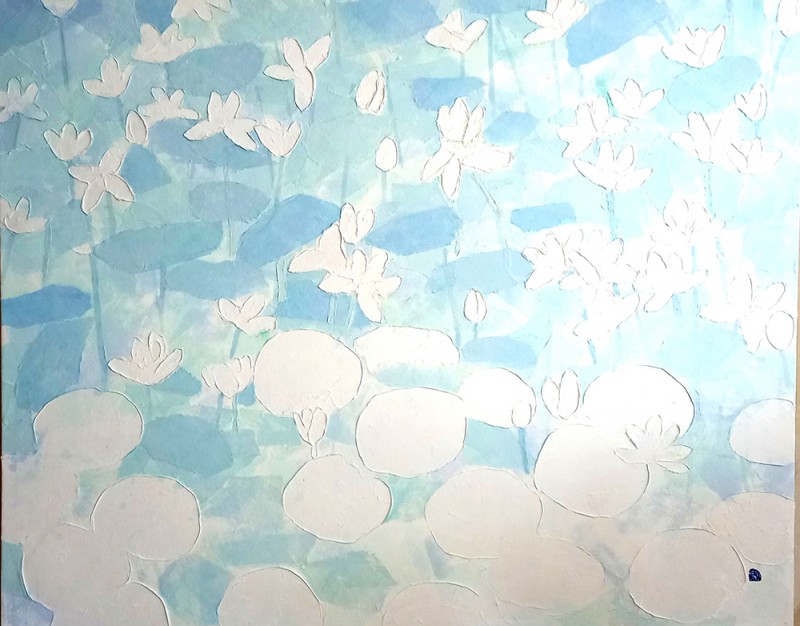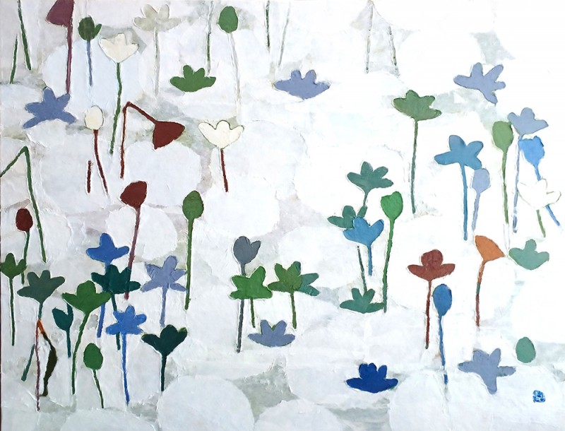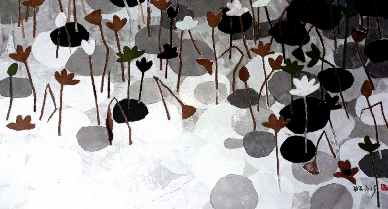 김춘옥의 그림을 보고 있자면 어느 호젓한 정원에 안긴 듯하다. 도시의 소음과 차단된 정원에는 잔잔한 물위에 고개를 내민 연잎들이 소복하다. 보이는 것은 연과 잔잔한 물결뿐이지만 조용히 귀를 기울이면 새소리,바람소리를 들을 수 있을 것같다. 눈부시게 하얀 햇살이 호수위에 쏟아지며 부서지는 수많은 광채를 볼 때 세상은 얼마나 찬란한지 김춘옥은 그런 자연의 세계로 우리를 안내한다. 김춘옥의 회화는 군더더기 없이 아담하고 정갈하다. 수묵을 사용하지 않았는데도 이런 느낌을 가질 수 있는 것은 탈속 및 순화된 정신세계가 그림속에 녹아있기 때문이다. 표면이 아닌 이면, 깊이를 지닌 고격한 조형이 그가 추구하는 회화세계이다. 흥미로운 것은 그의 회화는 그리지 않고 얻어진다는 사실이다. 말하자면 종이를 붙이고 그것을 다시 걷어내면서 이미지와 색감을 얻는 것이 김춘옥 회화의 특성이다. 일견 그림에서 떠나 있는 듯하지만 그의 작업은 여전히 회화 범주에서 벗어나 있지 않다. 김춘옥은 소지(素地)를 그 자체가 의미있는 조형으로 간주하면서 이를 통해 동양화의 아취를 되살리고 있다.
