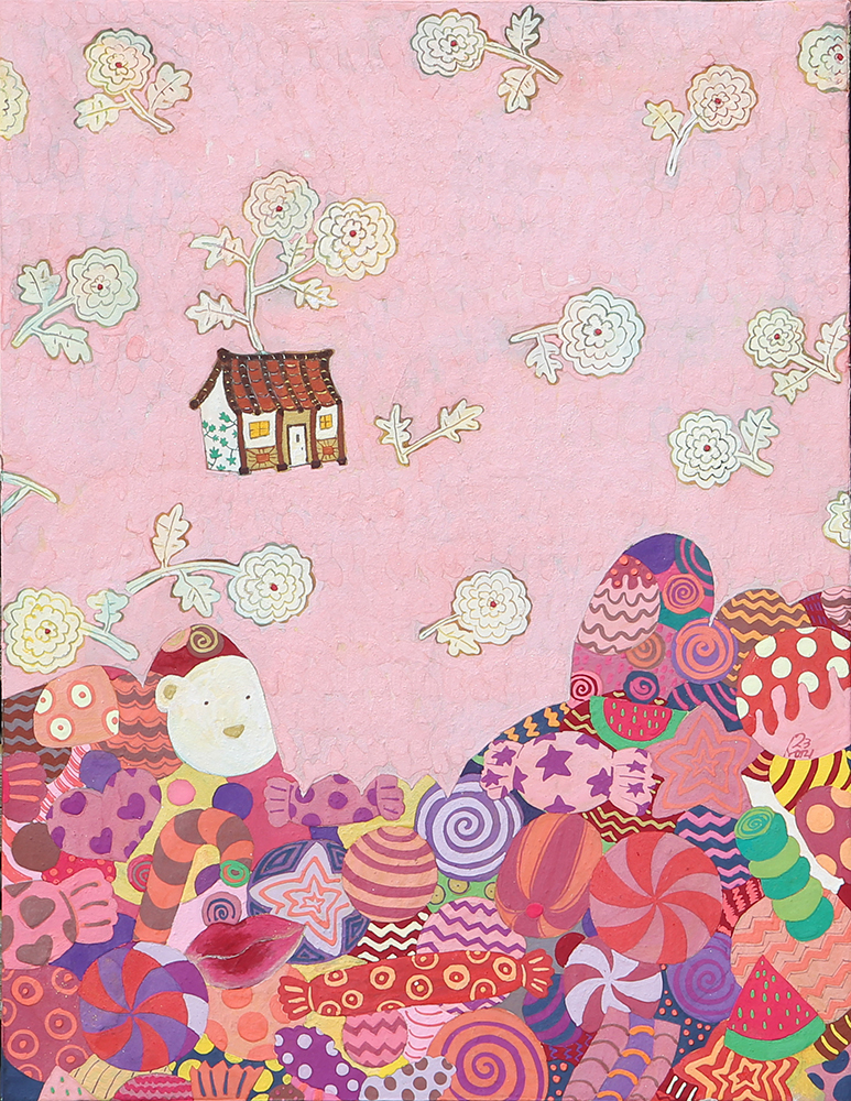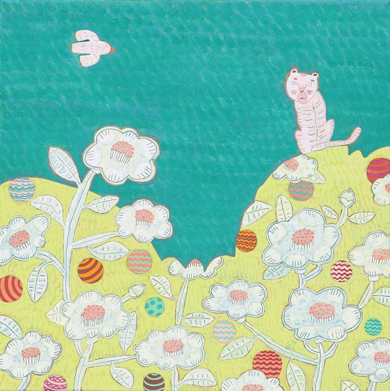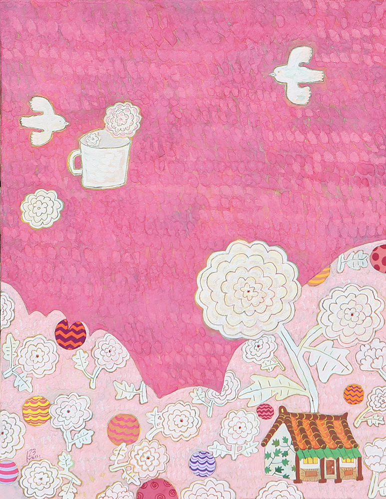 작품설명 장지壯紙의 바탕에 무수히 많은 반복적인 붓질로 색을 얹어나가는 과정을 거쳐야만 완성될 수 있다. 여러 번의 바탕 채색으로 얻은 중첩된 느낌은 그 자체로 시간의 집적集積을 의미한다. 그 위에 서로 다른 조형 요소를 가진 이질의 개체가 만나 조화로운 관계를 형성하고 새로운 어울림을 만들어 낸다. 시간의 집적 안에서 그것들의 조우는 스스로의 의미를 넘어서게 한다. 그리고 그 만남으로 생긴 새로운 일들이 나의 그림에서 펼쳐지고 있다. 그 새로운 일은 은근히 창조적이며 사랑스러우며 보는 이를 긴장하게 한다.