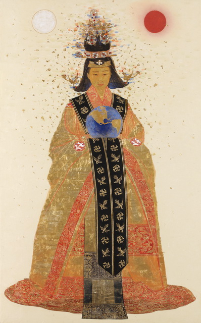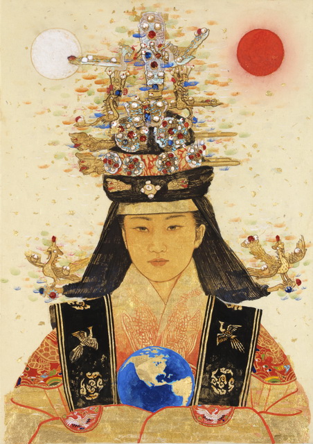 ●동양화를 전공한 서수영은 그동안 고려불화와 조선시대 산수화를 임모하는 작업 과정을 거치면서 ‘황실의 품위’라는 주제로 전시를 해왔다. 역사속 실존 인물 이기에 단순히 화구(畵具)만으로 인물을 조명하지 않으며 고전 회화가 전해주는 엄격한 형식미와 전통기법을 더해 인물을 그려내는게 최선의 가치라 믿는다. ●작품전체에 금박을 입힌 요철첨금법이라든가 석채와 수간채색 등으로 인물을 그려내는 것이다. 그러나 이런기법 사용에도 불구하고 서수영이 나타내는 그림은 고전 형식미에서 조금은 벗어난다. 인물이 정면으로 응시하는 엄격한 좌우대칭이 아닌 자연스레 고개를 아래로 떨구고 있다던가 인물 상단에 비행기가 출현하는 이미지를 의도하여 전통에 현대성을 조금씩 더하는 것이다. 특히 이번 신작에서 명성황후가 파란색 지구를 들고 있는 모습을 보여 주는데 이는 황실의 전통성을 강조하기 보다 2012년의 현대적 재해석이 강조된 것이라 보여진다. 이번 전시에서 조선의 왕후 3人(명성황후십육세상明成皇后十六歲像, 인현왕후상 仁顯王后像, 정순왕후이십팔세상貞純王后二八歲像)을 재조명해 작품으로 선보이는데 화려한 복식을 하고 대례식을 행하는 왕후의 모습은 가장 찬란하고 아름답지만 여성의 활동이 극히 제한되던 조선의 왕후로서 품위를 잃지 않고 어떠한 현명함으로 삶을 살았는지에 대한 모습을 보여 주고자 한다. ●작가는 작품안 인물에 치밀함을 더하기 위해 복식과 머리모양, 관련 기록물을 조사하면서 인물을 묘사해 왔지만 결국 작가가 그림으로 전하고 싶은 이야기는 역사속의 한 인물이 살아온 정신 이며 덕분에 우리는 그것을 통해 과거를 뒤돌아 보고 미래를 꿈꾸는 기회를 제공 받는다. 하루가 달리 변화하는 이 세상에서 서수영은 변하지 않는 것은 인물의 정신임을 동양화의 전통기법으로 그리고 작가의 해석이 더해진 초상으로 나타내려는 듯 보인다. |
