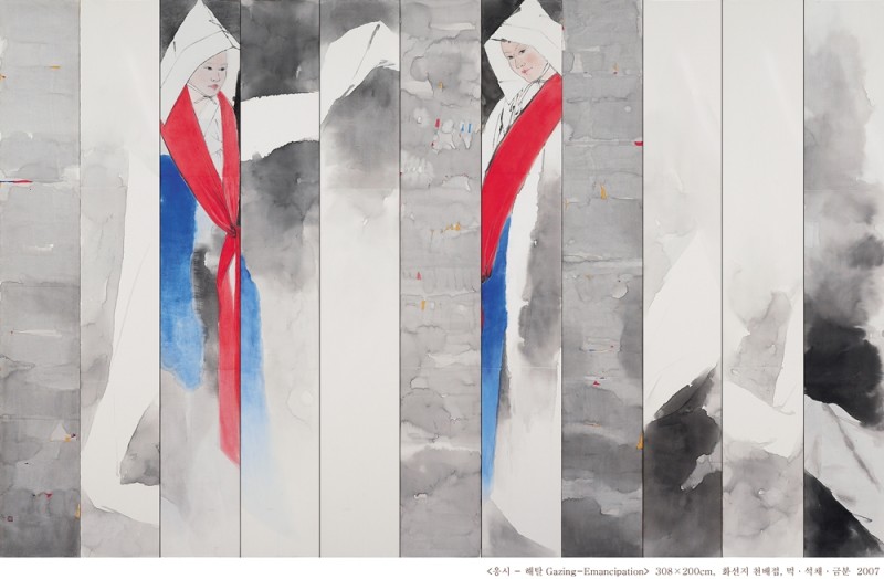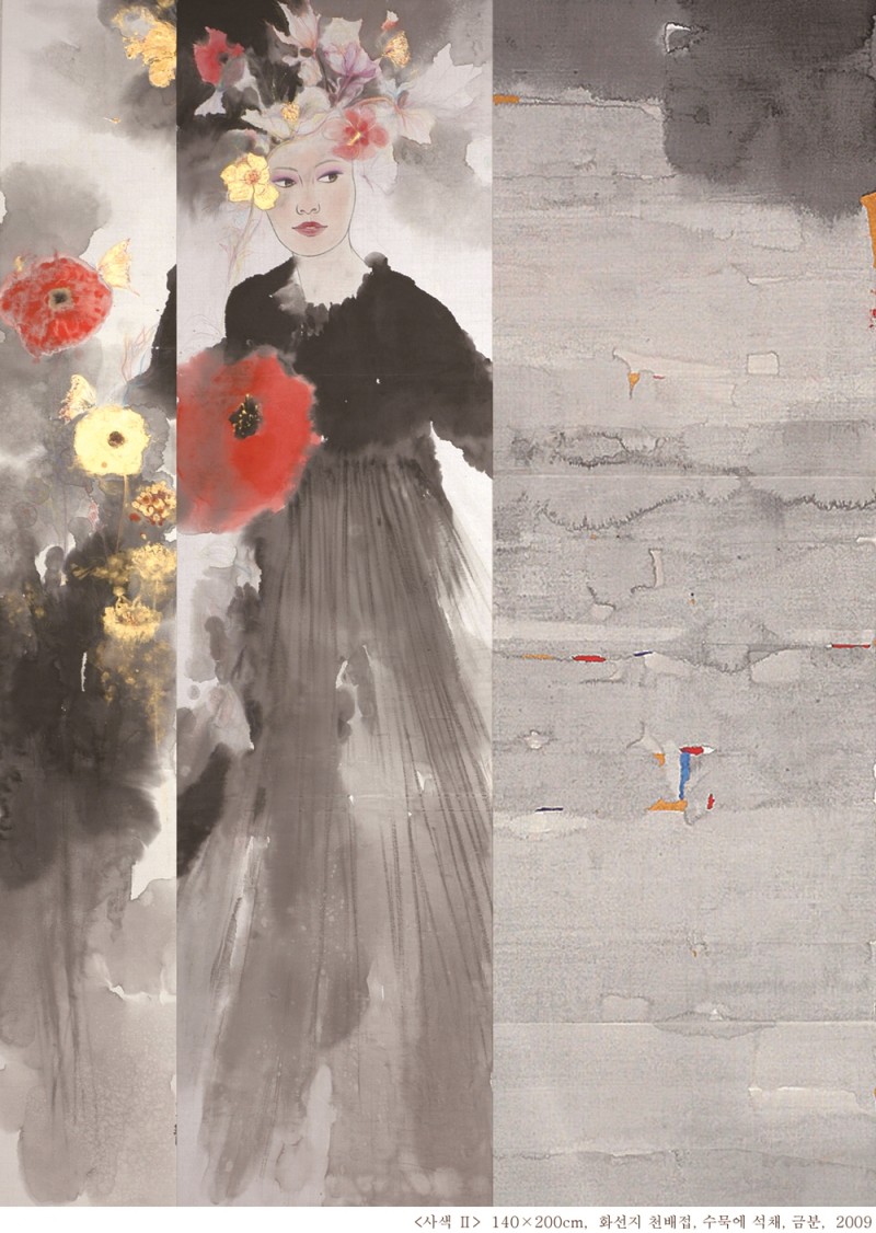 Ⅰ. 사회 및 자신의 지향과의 괴리: 은현(隱現)·장로(藏露)의 숨김(隱·藏)의 미학에서 드러냄((現·露)의 미학으로: 2007년 전시가 ‘숨김과 드러냄(隱現,藏露)의 미학’중 숨김(隱·藏)의 미학이 主였고, 인물화 화면과, 발묵(潑墨)과 발묵의 흔적에 靑·紅·黃色 점이 있는, 마치 하늘의 현색(玄色)인 듯한 다양한 먹빛화면들을 붙여 자신의 이상과 사회현실과의 괴리를 감성적으로 극화(極化)한 자신의 구사(構思, 즉 구상)를 한지에 천배접을 한 후 수묵(水墨)과 석채(石彩), 채색, 금니(金泥)로 실현하던 수묵·채색화는 옆에 붙은 먹빛화면이 탈춤의 소매의 일부로 이어지면서 그 하늘이 다른 하늘이 아니요 그녀의 하늘임을 밝혔었다. 그러나 2008년부터 그러한 연관이 사라지고, 폭 수와 크기가 줄고 채색이 강화되면서, 일폭화로 진행되거나 인물이 강하게 자기를 주장하면서 하늘의 역할은 더 강화되었다. K. 해리스(Harris)가, 서양 현대에서 초상화가 사라진 이유를 인간에 대한 ‘존경’이 사라졌기 때문이라고 보았듯이, 한국화에서도 인간에 대한 존경이 사라진 듯, 국전시대에 맹위를 떨치던 인물화가 사라졌고, 있어도 왜곡되거나 변형되었다. 이제 인물화는 동서양 모두에서 신(神)이나 자연이 아니고, 인간이 인간을 변형시키고 왜곡하는 작은 신(神)이 되었다. 중국회화의 전성기인 북송 말 선화화단(宣和畵壇)에서 수묵산수화와 채색화조화의 번창에도 인물화·도석화가 양적으로 가장 많았던 것은 세상의 주인이 여전히 인간이었다는 반증이요, 한편으로는 그 당시 인물과 안마(鞍馬)를 포용할 수 있는, 이공린의 백묘화(白描畫)같은 창안이 있었기 때문에 가능했다고 생각된다. 그러나 80년대 이후 한국에서 추상화가 번창하면서 서양화, 즉 피카소의 <아비뇽의 처녀들> <게르니카>에서처럼 대상의 왜곡, 변형과 달리, 시간이 갈수록 인물이 거의 사라졌다. 그러나 한국화에서도, 서양 현대처럼 현대를 대변하는 해석과 표현방식의 창안이, 즉 현실에 근거한 창안이 필요하다고 생각된다. 그러한 의미에서 유희승의 그림은 전통의 현대적 창안이라는 면에서 또 하나의 예의 탐구로 적절하리라 생각된다. 단독인물상의 조합에서 군상(群像)의 수묵 선화(線畵)으로의 회귀와 채색 화훼화·인물화에 삽입된 화훼화: 상술한 2007년 전시의 ‘숨김과 드러냄(隱現,藏露)의 미학’은, 2008-9년 이후에는 그녀에게 세상에 대한 자신감이 회복된 듯, 인물화면이 독립인물상으로 독립해 먹빛화면의 도움을 받지만, 그들 두 화면의 ‘나뉨과 합함(分合)’은 자유분방한 역할이 줄고, 짙은 발묵의 먹빛 화면의 하늘의 역할이 강조되나 그 괴리만, 어두움만, 커졌다. 괴리의 해결 시도인 듯, 얼굴을 숨겼던(隱,藏) 짙은 화장, 피에로의 화장, 탈, 고깔 등의 요소들이 사라지는 현대여성의 ‘드러남(現·露)’의 미학이 시작되면서, 여인의 머리부터 아래로 이어지는 금빛이나 채색 새의 화려함은 그녀의 불안의 역설적 표현이거나 어떤 ‘영원’에 대한 염원이 자리 잡은 것이 아닌가 하는 생각이 들고, 전통 초상화에서의 정면상의 등장, 인물에 불보살(佛菩薩)의 원형 두광(頭光)이나 원형 신광(身光)의 등장, 인물의 얼굴을 네모 화면으로 둘러싸는 이중, 삼중화면 등은 그러한 ‘드러남’의 미학으로 여인의 심상의 괴리, 즉 화의(畵意)의 간극의 심화를 역설적으로 표현한 것으로 보인다. 그러나 2012년 화훼화나 화훼절지(花卉折枝)에서는 2007년의 인물화면처럼 먹빛화면을 동반하나, 2008-9년처럼 먹빛 화면에 또 더 짙은 먹빛화면이 들어가는 이중화면이라든가, 발묵의 색이나 먹으로 형과 색이 흐려지거나 원형, 마름모형이 등장하기도 하는데, 이러한 분합이나 화면의 변화는 그녀의 세상을 보는 시각이 변했음을 보여준다. 서양화에서는 새나 꽃은 ‘금방 사라짐’의 알레고리로 쓰였으나, 그녀의 그림에서는 아름다운 채색 화훼화로 독립된 꽃들은 대상을 사회현상전체로 이해하기보다는 어떠한 어려움에도 매년 철이 되면 피는 꽃의 성(性), 즉 ‘자연(自然)’을 금니로 ‘영원’을 상징하고, 옛 화조화처럼 잠깐 아름다운 꽃으로 눈을 돌리면, 그녀가 말하듯이, 그 화려하고 아름다움이 우리에게 ‘위로’,‘평화’‘자유’‘사랑’이 되어, 그녀의 간극은 그러한 ‘자연’으로 보상되었다. 그러나 꽃과 새, 나비는 몰골(沒骨)의 색이 동양화의 궁극목표인 ‘평담(平淡)’이기는 하나 아직 ‘간솔(簡率)’로는 가지 못해, 사회의 엄중함은 아직 괴리의 해결 과정임을 보여준다. 한편 성장한 여성그림에서는 발묵이 농색으로 강화되고, 옆에 붙은 먹빛화면도 다양해져, 하늘의 역할은 더 커지고 다양화되었다. 여인은 심해지는 불안을 역설적으로 짙은 화장으로 덮거나 양귀비 등의 화려한 적(赤)·황색(黃色)의 절지(折枝) 꽃과 새, 나비로 성장(盛裝)하고, 얼굴만의 소(小)화면의 크로즈 업이 등장하는가 하면, 그들 절지(折枝)의 붉은 양귀비, 노랑·파랑 꽃이나 화분에 심겨있는 매화, 절지 매화, 청화백자 속에 꽂혀 있는 모란이나 양귀비는 화훼절지(花卉折枝)로 분화하고, 2012년부터는 자기(磁器) 화분에 담기거나 화병에 꽂혀 있는 