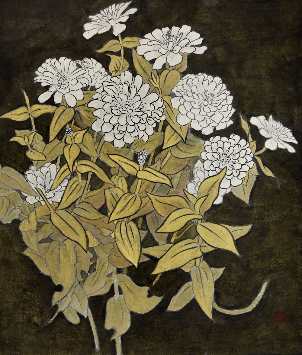 땅속의 생명체가 동면에서 깨어난다는 정유년 경칩驚蟄에 즈음해 수묵채색화가 안해경이 우리가 잠시 잊고 살아온 ‘여유’를 주제로 근작전을 위한 신작들에 몰두하고 있다. 여유는 어원적으로는 둘 이상의 것을 ‘함께 놓는다’(put together)는 말에서 유래했지만, 물신物神주의가 팽배한 오늘의 발빠른 사회에서는 까마득한 옛 일로 기억되고 또 잊혀졌다. 그러나 근작전에서 안해경은 여유가 애초 우리와 지근 거리에 있었다는 걸 작품으로 보이고자 한다. 이를 위해 주변에서 흔히 볼 수 있는 백일홍과 목단을 빌려, 찌든 세속에서도 여유를 잃지 않았던 조선시대 선비들의 배려配慮의 마음을 반추하는가 하면, 달항아리의 표면에 수국과 연화를 근접시켜 그렸던 선대 화가들의 여유를 오늘의 자신의 것으로 전유하고자 한다. 더 나아가 작가는 여유가 끊임없이 새 생명을 산출하는, 요컨대 자연의 원천이라고 생각한다. 작가 안해경이 ‘여유’에 주목한 건 2천 년대 초반(2013)이다. 이 방면의 연구로 박사학위를 취득하면서였다. 한국적인 것에 대한 관심으로 담묵과 채색공간의 미적 특성을 다루면서다. 2014년부터는 <유기적 관계>를 빌려 노동자, 어린이, 꽃, 나무, 풀잎을 배경으로 전경의 인물을 일원화하기에 이르렀다. 이 시도는 과거에서 현재에 이르는 역사속의 인간과 그들의 반면상反面相을 부각시키려는 데 있었다. 그러했던 작가가 근작전에서는 이들의 반면상을 뒤로하고 여유의 자연본성에 직설적으로 접근한다. 이른 바 ‘여유예찬’을 위한 ‘부[賦, ode]’의 형식을 빌려서다. 백일초[草]과의 백일홍과 목단을 모팁으로 종래의 담채에서 떠나 농채를 빌려 사회의 불안정과 고단함 속에서 안정과 균형을 바라는 중생들의 애환을 부각시키고자 한다. 그녀가 근자에 다루는 회심의 백일홍은 부처꽃과의 교목에 피는 화려한 백일홍이 아니다. 국화菊花과의 일년생 관상용 풀인 엉겅퀴과에 속하는 범상한 꽃이다. 엽액에서 줄기가 나와 가지 끝마다 꽃을 피우는 민초의 끝판이다. 이번 전시에서 백일홍과 목단은 삶의 균형과 안정을 바라는 민초들의 메타포로 등장한다. 이들의 하양, 노랑, 주황, 녹색은 조야하지만 삶의 여유를 잃지 않고 살아가는 민초들의 생의 의지를 보여주는 레토릭으로서의 빛깔이다. 이들의 색조에다 밝음과 실루엣을 교차시켜 여유를 갈망하는 뭇 중생들의 애환을 노래한다. 작가의 이 메시지는 삶에 지친 우리 모두에게 여유를 배려하기 위함이다. 이를 위해 화려하지 않으면서 유려한 선들을 간직한 목단과 백일홍의 꽃잎, 달항아리의 우아한 영롱미, 흐르는 물결같은 실루엣의 퍼플, 어둠을 배경에 둔 색상과 명도의 대비는 불균형한 현실 속에서 안식을 구하는 뭇 영혼들에게 여유를 선물하고자 하는 회화적 헌사獻辭로서 다루어졌다. 근작들의 백일홍과 목단은 작가가 배경에 어둠 아니면 비어 있는 여백으로 설設한 여유의 상징체이자 결코 마름이 없는 ‘자연의 근원’origin of nature을 대표하는 메신저들이라 할 것이다. 이것들을 빌려 작가는 자신이 겪고 있는 실존의 고뇌와 상실의 아픔을 상징적으로 치유하고 복원한다. 안해경이 근작전을 빌려 자신의 회화의 존재이유를 시사하는 키워드가 이것이다. 2017, 3 미술평론가 김복영 학력 2011 숙명여자대학교 조형예술학과 미술학 박사(한국화 전공) 1994 숙명여자대학교 대학원 회화과 졸업 1992 숙명여자대학교 미술대학 회화과 졸업
