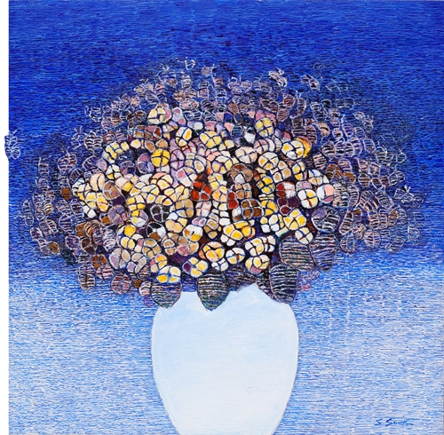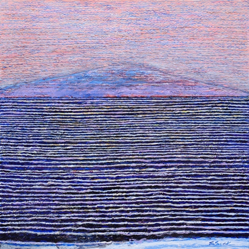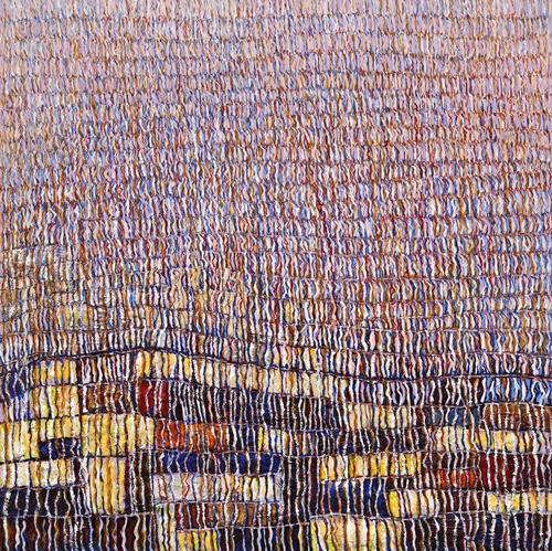 마음이 머무는 곳 / 오란 우란치멕 (미술평론가, 미국 버클리대학 박사) 채성숙의 작품을 보는 사람들은 여러 가지 감상을 갖게 된다. 작가는 전시회를 ‘마음이 머무는 곳’ 이라고 제목을 붙여 영감의 원천을 제시하였지만, 필자가 보기에는 작품 내용이 다양할 뿐 아니라 관객이 여러 갈래로 다양하게 해석할 수 있도록 한 점에서 관대하다고 할 것이다. 따뜻한 색조와 세밀하고 섬세한 운필은 전체적으로 서정적인 포근한 느낌을 준다. 작가가 선호하는, 겹겹으로 쌓은 꾸불꾸불한 실과 같은 얇은 선으로써 수평으로 혹은 수직으로 모양을 만들어 내는 구성 방식은 리듬감 있는 질서와 잔잔하게 움직이는 듯한 율동감을 준다. 또한 그것이 따뜻한 색조의 운율 속에 자리잡음으로 해서 근원에 대한 그리움과 존재의 슬픔을 나타낸다. 작가가 선에 집착하고 선을 겹겹이 쌓는 방식을 씀으로써 작품 속 색채의 스펙트럼을 고양하고 다양화한다. 뿐만 아니라 그 기법은 작품 속에 두터운 질감과 다차원 세계가 나타나게 하고 그리하여 우아하면서도 정지되지 않은 연속적인 율동감의 환영을 보게 한다. 다른 한편으로 그 선들은 베 짜기와 태피스트리(tapestry)가 연상되어 이 작품들이 섬세한 여성의 손길이 만든 작품이라는 것을 확실히 알 수 있게 한다. 이러한 구도상의 변화와 함께 작가는 여러 가지 다양한 재료를 사용하여 성공적인 실험을 하였다. 캔버스와 아크릴을 주로 사용하였지만, 때로는 판지 위에, 또는 분말을 혼합한 재료를 화면에 섞어 놓는다든지, 혹은 양모를 물감과 함께 사용한다. 특히 양모각을 활용한 것이 흥미로운데, 이것이 색채와 합성되어 서로의 장점을 고양시키고 함께 어울리면서 천연스러운 삼차원의 짜임새를 가진 특이한 표면을 창출해 냈다. 색채가 자연의 색깔을 원하는 대로 잘 나타내었을 뿐 아니라, 재료가 바탕 화면과 독특한 방식으로 상호 작용을 하면서도 재료 그 자체의 장점이 표면에 잘 표출되어 있다. 또한 천 조각은 바탕 화면과 잘 조화되면서도 그 재질이 가지는 특장(特長)을 그대로 유지하여 작품 속에 원래 존재하던 활력을 새롭게 더 했다. 또한 작가는 분말을 사용하였는데 그 천연스럽고 반짝이는 듯한 질감이 나타나는 듯 숨었다. 작가가 작품에 이 기법을 주로 사용한 것은 의도적이며 오랜 심려의 결과인 듯 하다. 이 미세 분말의 크리스탈 입자가 색조 속에서 반짝이면서 신비로움을 지닌 추상적 구도를 완성시킨다. 채 성 숙 Chae, Soungsook 이화여자대학교 미술대학 동양화과 및 동 대학원 졸업