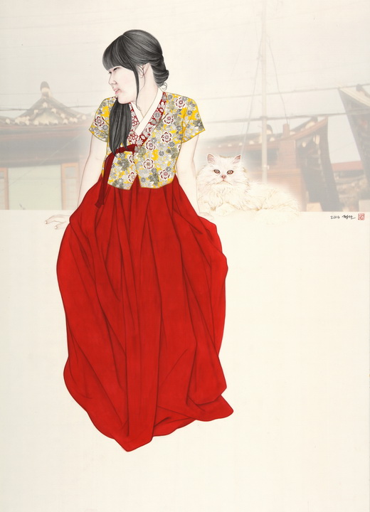 바야흐로 한류의 시대이다. 대중문화에서부터 그 유행을 주도해 오던 한류는 이제 한국의 문화와 전통까지 관심의 대상이 되고 있다. 이러한 가운데 한국 전통의 매체와 필법으로 작업을 지속해오고 있는 나에게 한류는 또 다른 작업의 모티브로 의미를 제공하고 있다. 한국의 전통의상을 입은 여성의 초상화 ‘21세기 미인도’와 동자승을 비롯한 어린이 그림 등 내 작업은 “북촌을 거닐다”라는 이번 전시를 통해 그림에서 전통적인 방식의 인물 표현과 함께 북촌이라는 장소성 까지 구현하게 되었다. 서울은 우리나라의 역사상 중요한 장소이다. 조선왕조 오백년을 이어 지금까지 우리나라의 수도로 자리를 차지하고 있는 서울은 현대화된 도시이기도 하지만 문화와 역사가 고스란히 남아있는 곳이기도 하다. 특히 서울 한 가운데 위치하고 있는 북촌은 최근 몇 년간 많은 주목받고 있는 곳이다. 북촌은 경복궁과 창덕궁, 종묘의 사이에 위치하며 서울의 전통가옥이 밀집 되어 있는 곳이다. 청계천과 종로의 윗동네라는 이름에서 ‘북촌’이라는 이름으로 불리었는데 지금의 가회동, 삼청동, 원서동, 재동, 계동 일대이다. 실제로 주민들이 거주하는 한옥이 밀집되어 있는 이 지역은 근래 들어 한류의 붐과 더불어 내외국인들의 주요 관광코스가 되었다. 나는 이곳을 십 수 년 전부터 자주 드나들게 되었다. 가르침을 목적으로 다니게 된 이곳의 이전 모습은 한적하고 여유로운 모습이었다. 인적이 드물고 상가조차 희소하여 소란스럽지 않고 지루하기까지 한 곳이었다. 거리를 지나가는 사람이라고는 지역 주민들이 고작이었다. 그러나 2016년 현재 이곳은 예전의 모습과는 완연히 달라진 모습이다. 갤러리, 카페, 상가, 그리고 밀려드는 인파는 이곳이 유명한 관광지임을 증명해준다. 그리고 무엇보다도 눈에 띄는 모습은 한복을 곱게 차려입은 여학생들의 모습이다. 정성을 다해 지은 단아한 복장은 아니지만 우리 한복의 고운 선을 살려 화사하고 현대적인 감각으로 디자인한 개량한복을 입은 여학생들의 모습은 보기에 흐뭇하다. 과거 일본을 자주 드나들던 사람들은 기모노를 입고 거리를 다니는 여인들의 모습이 보기가 참 좋았다고들 말했다. 그리고 그러한 모습이 부럽다고들 했었다. 그러한 모습이 지금 서울 사대문 한가운데 주택가에서 연출되고 있다. 외국인 관광객들도 서투르지만 서슴없이 한복을 빌려 입고 북촌 곳곳을 다니며 사진을 찍어댄다. 이러한 모습이 현재 북촌의 풍속이다. 한복과 승복 등 한국적인 의상을 모티브로 작품 활동을 해왔던 나에게 이러한 모습은 관심을 가지게 하는 소재들이다. 그리고 십 수 년간 다니던 북촌이라는 거리 역시 나에게는 큰 의미가 있는 장소이다. 그러한 이유로 ‘한옥’과 ‘한복’이라는 두 콘텐츠는 자연스럽게 나의 작업의 중요한 모티브가 되었다. 한국의 미를 대표하는 한옥과 한복의 표현은 한국화를 전공하고 줄곧 한국적인 이미지만을 다뤄왔던 나의 작품과 자연스레 접목될 수 있다는 생각이다. 한 인물의 이미지를 통해 많은 의미부여를 해왔던 과거의 작품들과는 달리 시각적 이미지만으로 충분히 의미전달이 가능한 이번 작업들은 현대 풍속화이다. 한번쯤을 지나봤을 법 한 익숙한 장소의 이미지들은 사진이라는 매체를 통해 풀었다. 회화의 죽음을 선고한 이래 그림이라는 영역이 위축 되면서 나는 사진과 그림이라는 질문에 대해 끊임없는 의문을 가지고 그림에 사진을 차용하는 방식으로 작업을 하고 있다. 이러한 맥락에서의 사실적인 사진 배경은 익숙한 풍경을 더 친근하게 보여주고 미인도라는 전통적인 소재의 그림과 이질적이지만 조화를 이루며 현대 풍속화로서의 의미를 더 할 수 있을 것이다. 사진을 이용한 배경 작업은 이질적이기도 하지만 서로 조화를 이루며 하나의 작품을 만들 낸다. 이것은 어쩌면 전통과 현대가 공존하는 이 세대의 모습이기도 할 것이다. 이번 작품들은 너무나 한국적인 두 가지 컨텐츠인 한옥과 한복의 모티브를 통해 많은 사람들이 우리의 것을 더욱 자랑스럽고 소중히 생각해 주었으면 하는 바람과, 사진의 이미지가 난무한 이 시대에 전통의 방식으로 그림을 그린다는 것의 의미가 무엇인지에 대한 나의 고민이다. 2016년 10월 김정란 |