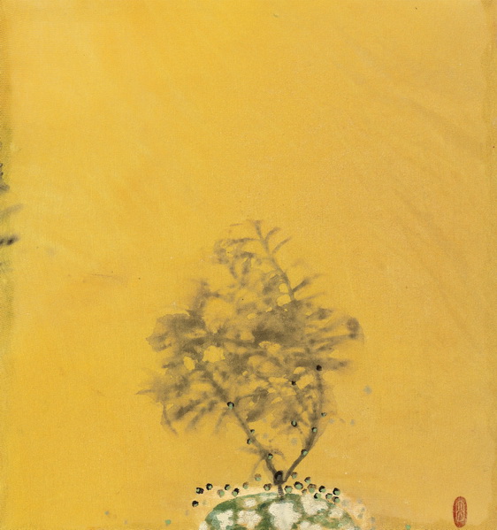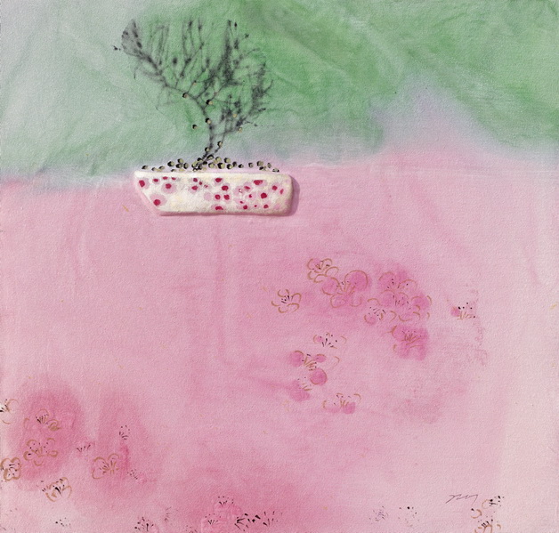 작가는 말하기를 우연히 버려진 화분이 자신에게로 온 것이 계기가 되어 지금의 그림이 탄생했다고 말한다. 그 화분 하나가 문득 자신의 유년기를 떠올려주었던 것이다. 아침이면 장독대로 감꽃이 후두둑 떨어지는 소리를 듣고 깨어나곤 했다고 말하는 작가는 온갖 꽃과 나무들이 가득한 자연 속에서 자란 그 시간대를 온전히 기억하고 있다. 그러나 지금 자신이 살고 있는 도시에서 접하는 자연은 가축화된 자연들이 대부분이다. 전선줄에 칭칭 동여매어 있는가하면 가지마다 철사로 비틀어 묶어 놓은 분재 등이 그렇다. 본래의 자연에서 벗어나 인위적으로 길들여지거나 기이하게 관리되는 나무와 화분을 보는 순간 작가는 슬픈 감정을 갖게 되었다고 한다. 그래서 생각해낸 것이 저 나무와 풀을 본래의 자연으로 되돌려 보내는 것이자 유년시절의 자연 속으로 되돌아가보는 상상이었다. 그러니 작가의 그림은 바로 그 슬픈 감정으로 빚어낸 장면이자 유년의 자연공간에 대한 기억의 이미지화인 셈이다. 그래서 어린 시절 경험했던 자연과의 추억, 시정이 안개처럼 퍼지고 햇살처럼 반짝이는 그림이 되었다. 휴식과 치유의 공간으로 돌아가고 싶은 바람이 깃든 풍경이다. 그렇게 해서 작은 화분, 나무를 연상시키는 이미지가 슬쩍 들어가고 자연에서 받은 감흥과 시정은 아련한 색채로 천을 홍건하게 적시면서 퍼져나가고 희미하고 안쓰러운 추억의 이미지들은 간소한 선과 희박한 물성을 지닌 색상으로 응고된다. 그러고 보니 나무처럼 보이는 선은 식물의 줄기를 닮았고 작은 집처럼 보이는, 점토로 붙여놓은 물체는 화분에 해당하는 것이기도 하다. 가능한 화분은 화려한 색조로 치장을 했고 나무는 어두운 먹색으로 그려놓아 대조를 이루었다.
