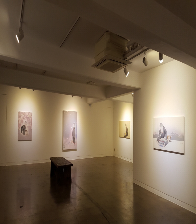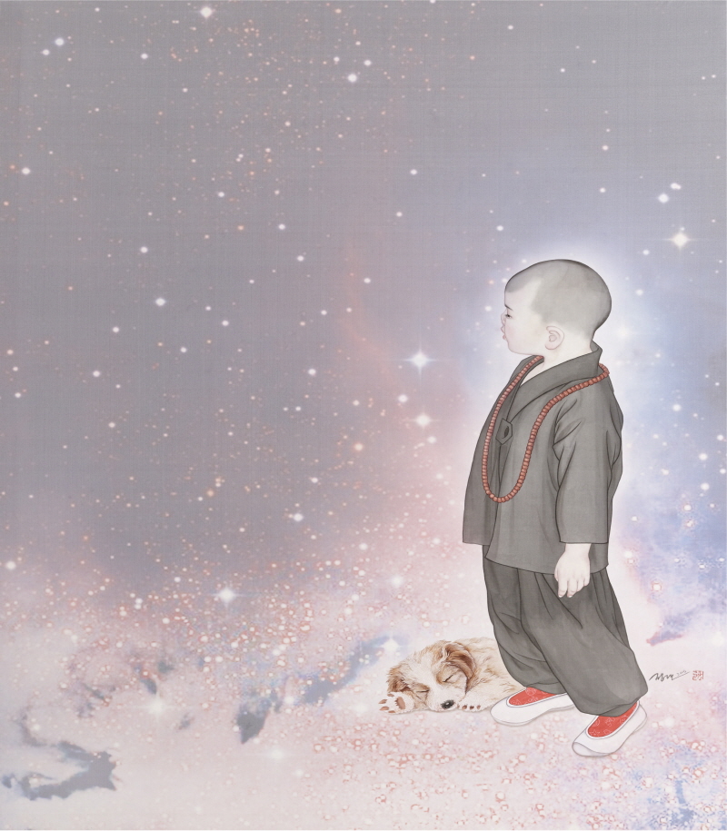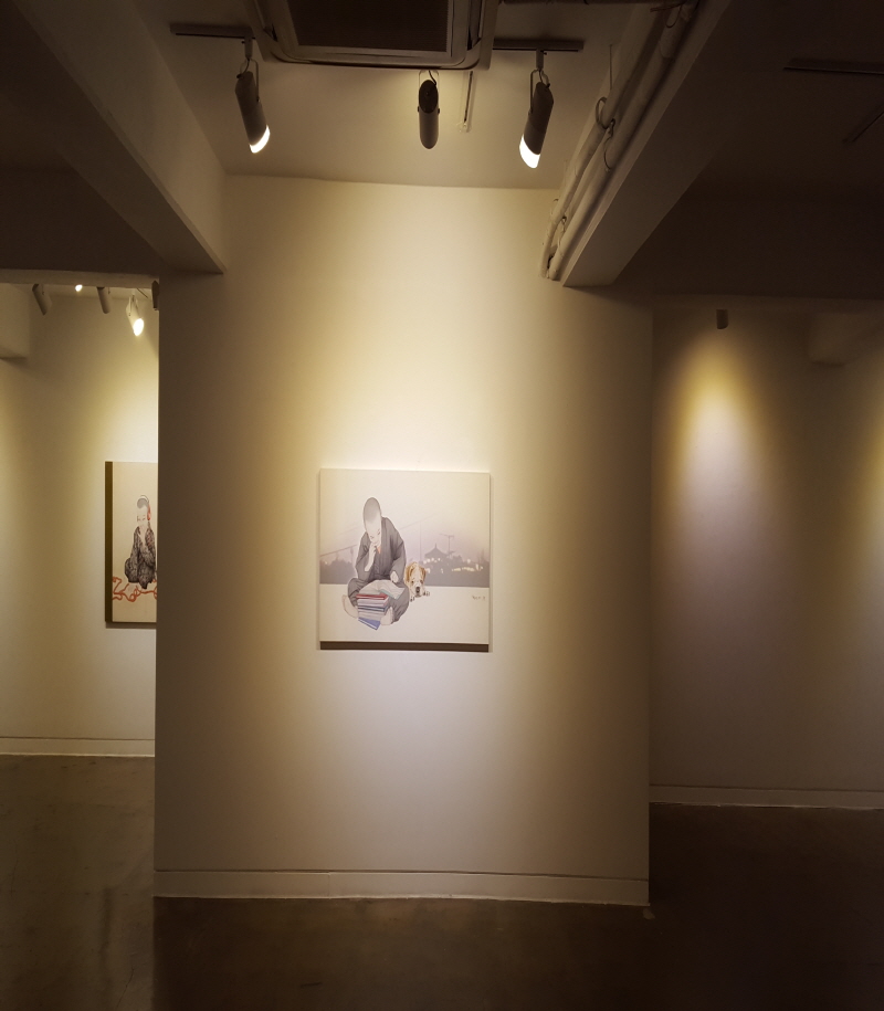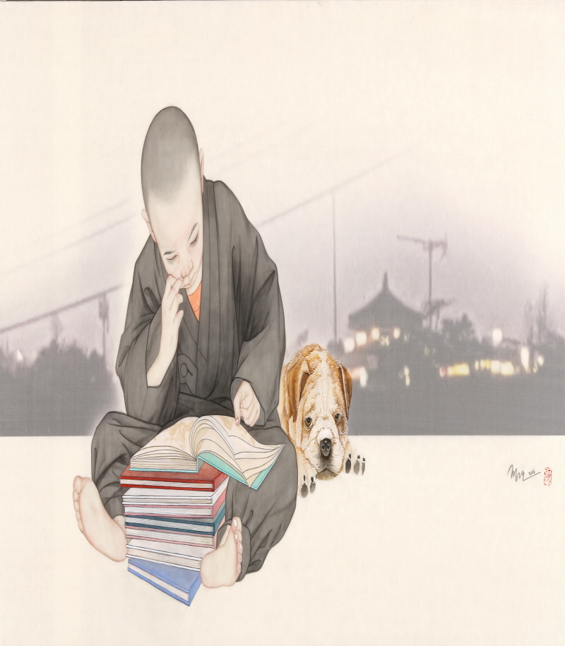 나의 그림 속 인물들은 대부분 혼자이다. 그래서인지 외로워 보인다고들 한다. 그림은 작가의 속내를 가장 잘 알 수 있는 매개체일 것이다. 그렇다면 내가 외롭다는 것인데... 그림 속 인물들은 딱히 나를 상징하는 것은 아니다. 동자승의 이미지로 인해 종교적 관점에서 오해를 받을 때도 많다. 그러나 나는 불교를 종교로 가지지 않고 있으며, 그림 속 동자승 역시 나를 상징하는 것은 아니다. 나의 그림 속 동자승은 인간 보편의 모습이다. 외로울 수밖에 없고, 몸을 두르고 있는 승복은 자유롭지 못한 인간의 규율 혹은 페르소나라고 할 수 있을 것이다 기독교 심리학자 폴 투르니에(Paul Tournier, 1898-1986)는 인간은 누구나 등장인물로 살아갈 수밖에 없다고 말한다. 가정의 일원으로, 사회의 구성원으로, 그리고 내가 만든 나의 상을 위해 우리는 늘 등장인물로 살아간다. 이런 나의 외로운 아이들에게 최근에는 친구가 생겼다. 비록 인간은 아니지만 마음을 줄 수 있는 누군가가 있다는 것은 존재를 확인하게 해준다. 그래서 사람들은 자신의 존재를 확인시켜줄 친구를 찾을지 모르겠다. |