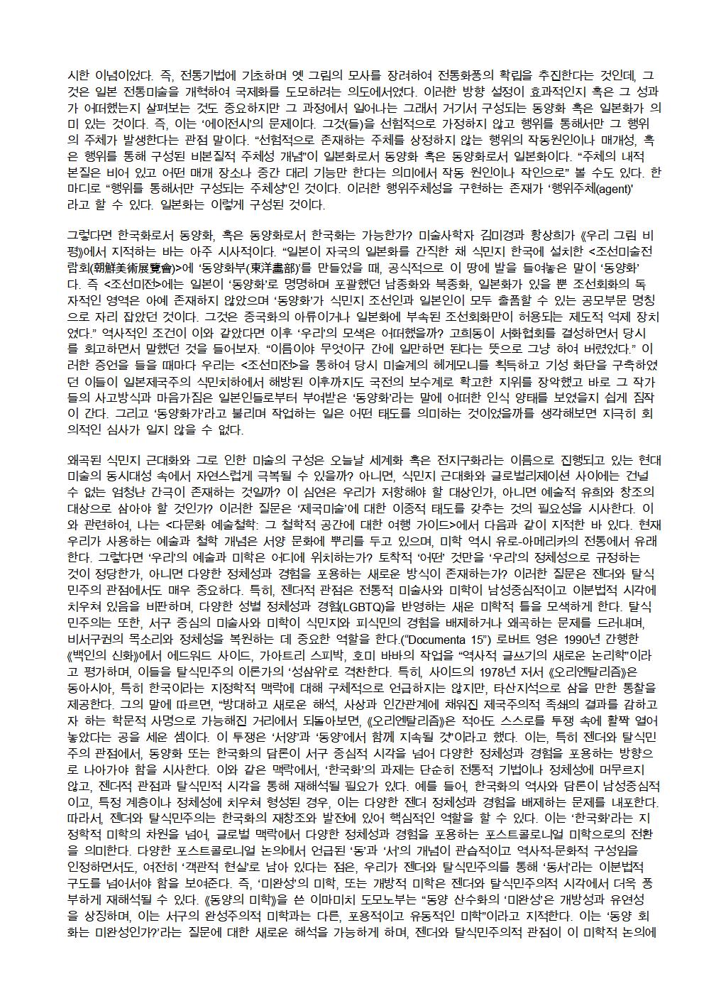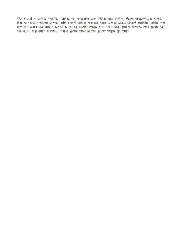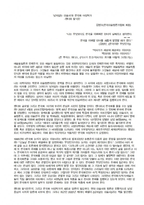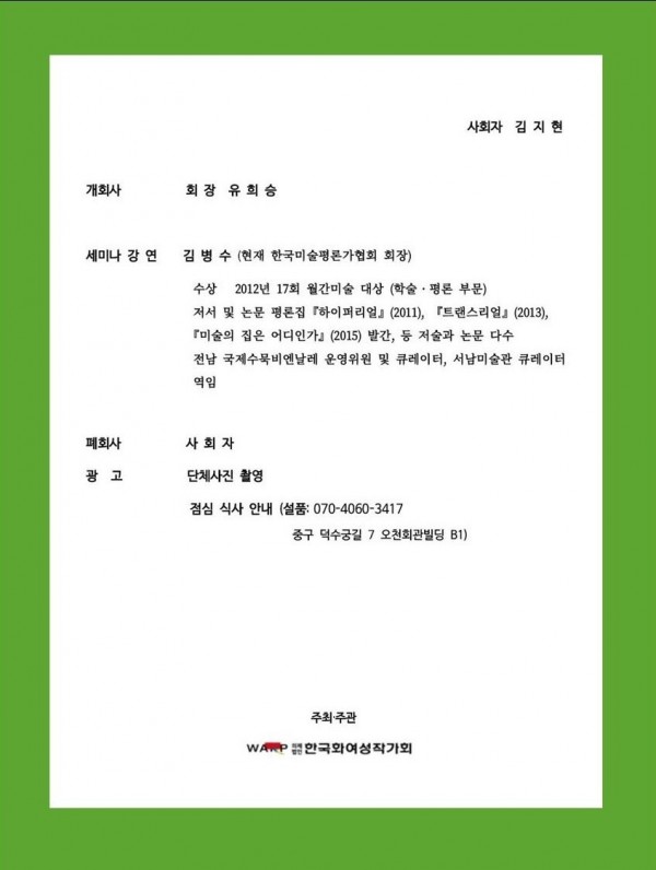 2025 제26회 정기전 주제 세미나[ '남자없는 미술사' 와 한국화 여성작가 ] 서울시립미술관 세마홀 1 페이지 정보 작성자 우먼아트 작성일25-06-16 00:41 조회282회 댓글0건 관련링크 이전글 다음글 목록 본문 댓글목록 등록된 댓글이 없습니다. 이전글 다음글 목록